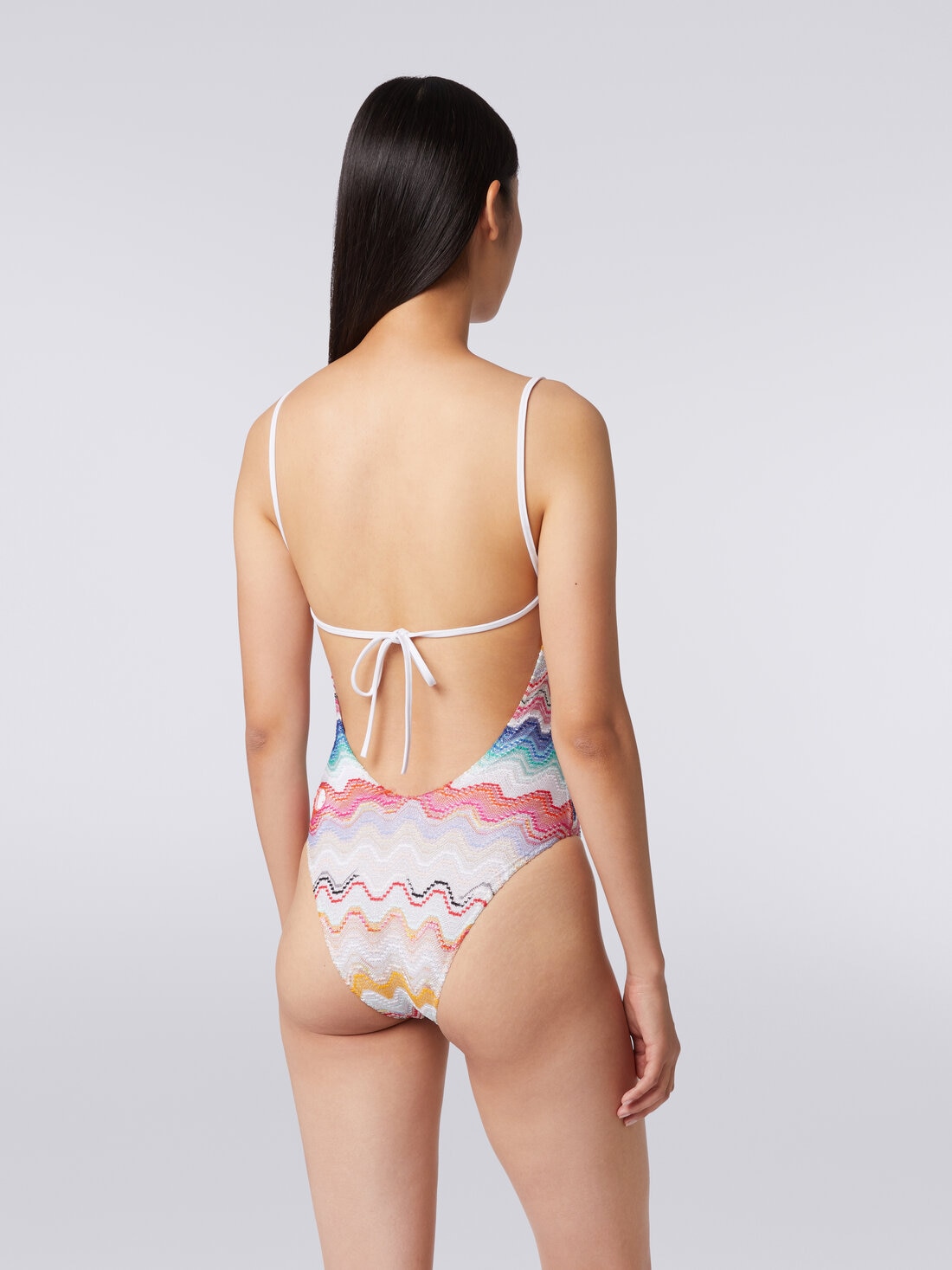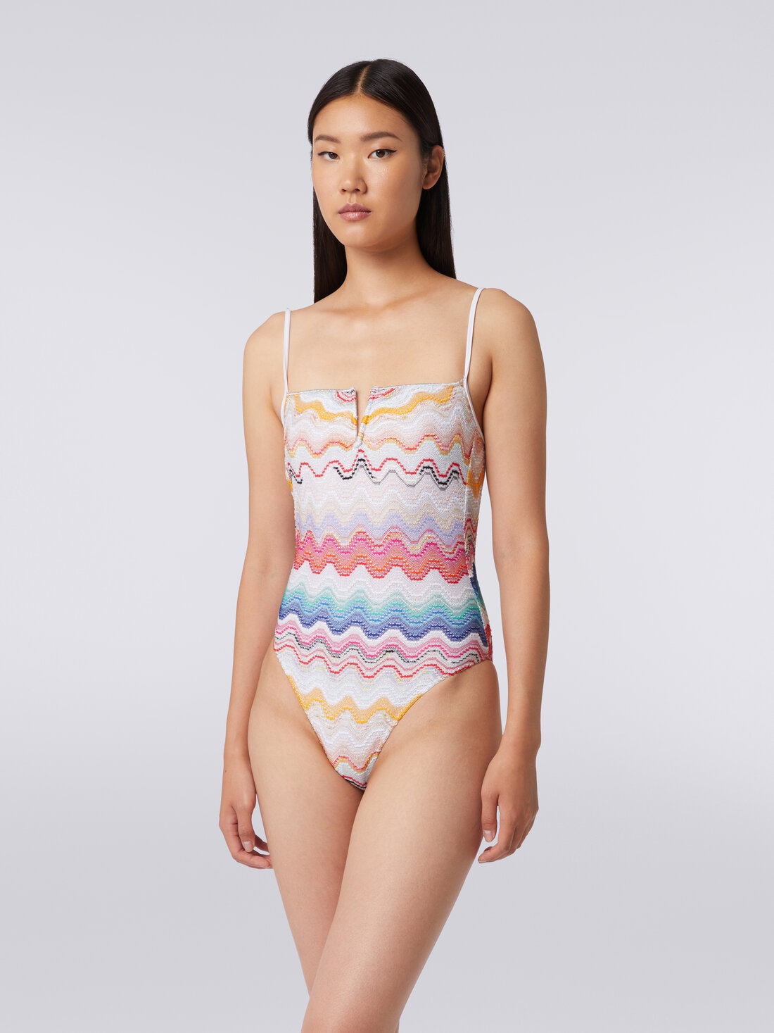 Ein geometrisch geschnittener, von schmalen, im Rücken zu bindenden Trägern gehaltener Ausschnitt kennzeichnet den Badeanzug. Er ist in Maschenware aus Mischviskose mit Wellenmuster gefertigt und mit einem Hauch Lamé veredelt.