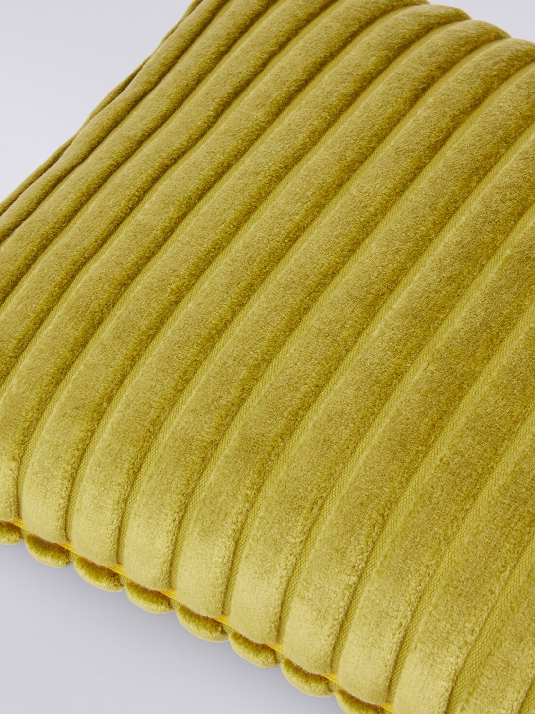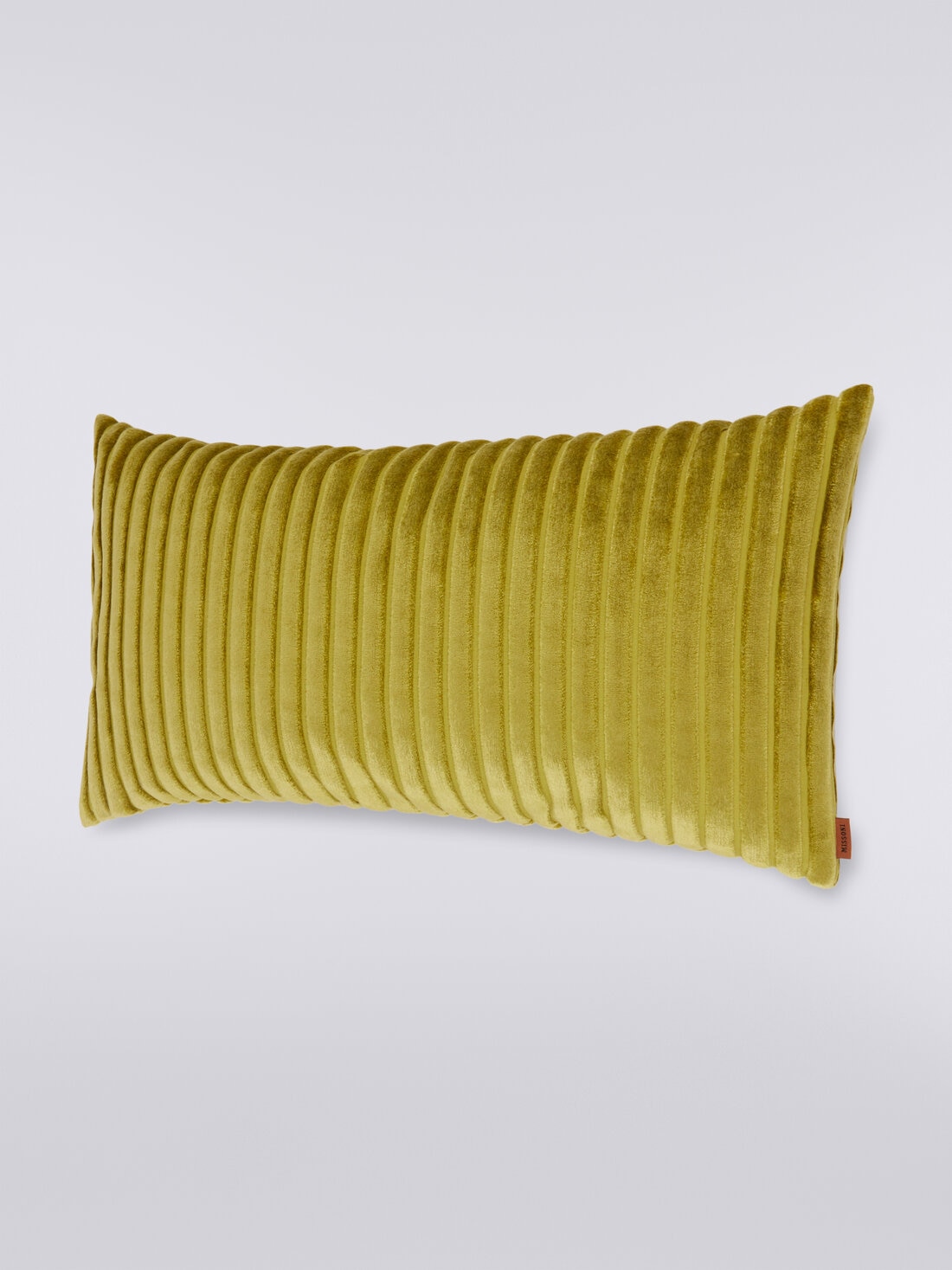 Ein 3D-Streifenmuster, bei dem sich glatter Stoff und Chenille-Streifen abwechseln, für das Kissen Coomba 30x60 cm. Dieses dezente Wohnaccessoire aus Mischgewebe in Viskose und Baumwolle verleiht jedem Raum einen Tick Eleganz.