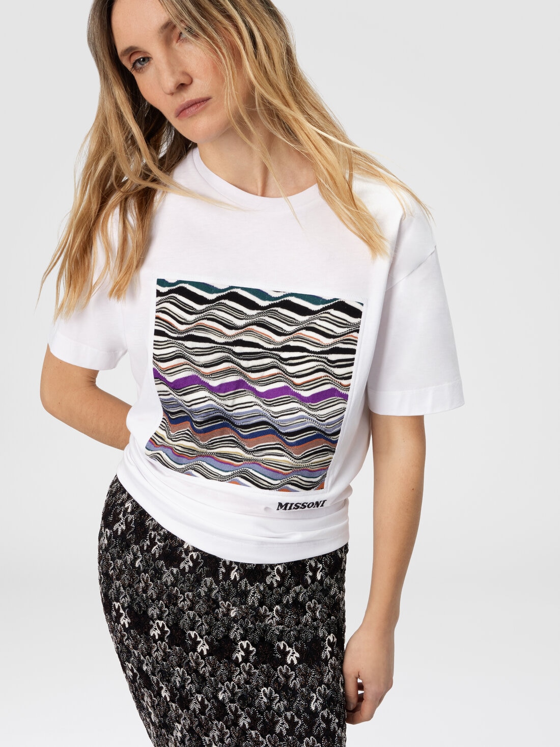 Damen-T-Shirt mit kurzen Ärmeln aus Baumwolljersey, veredelt durch ein frontales Welleneinsatz aus Strick, der dem Design Textur und Bewegung verleiht. Das Missoni-Logo rundet das Modell mit ikonischer Signatur ab – für lässige Eleganz mit Wiedererkennungswert.