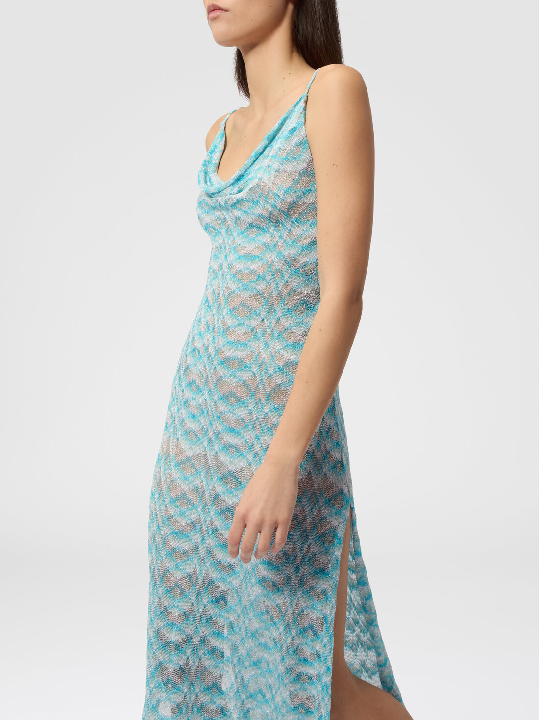 Das schattierte Viskose-Lamé umhüllt die Silhouette dieses langen Damen-Strandkleides, das durch einen offenen Rücken und seitliche Schlitze betont wird, welche die Bewegung elegant unterstreichen.