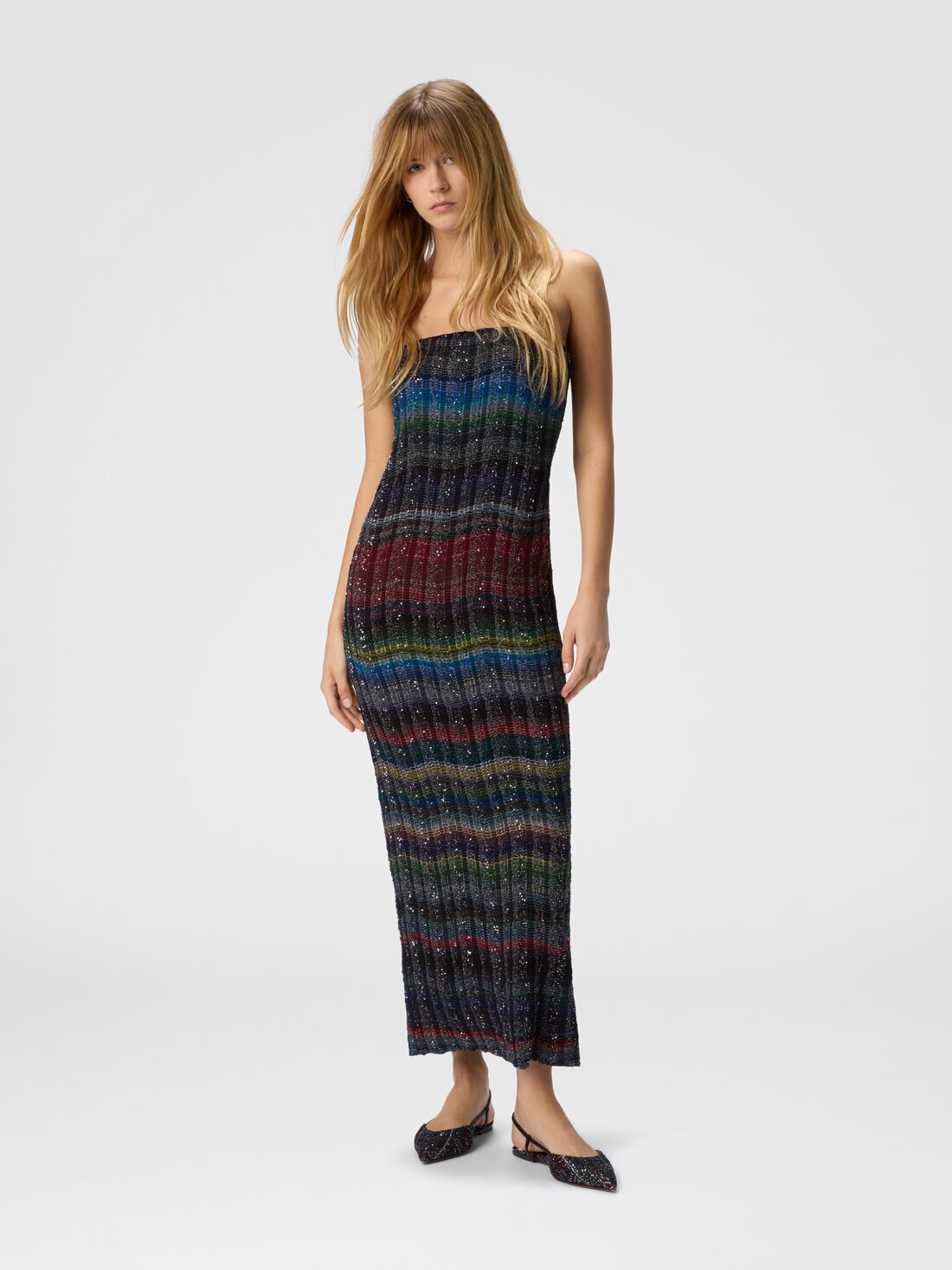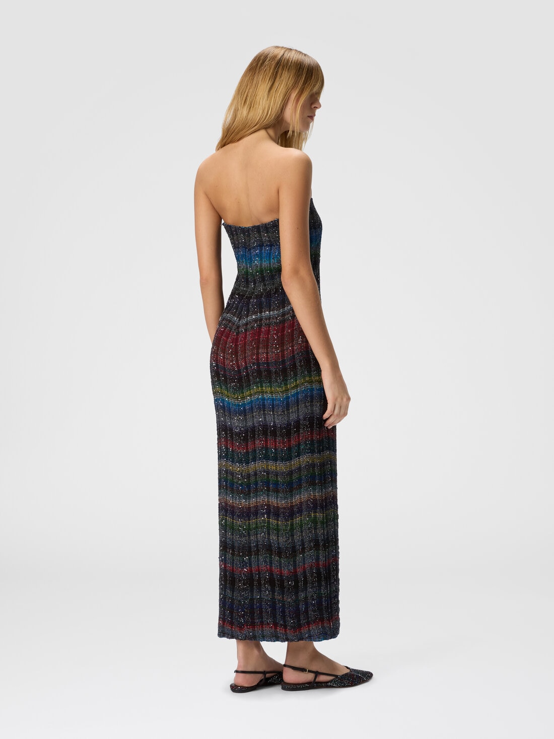 Ein trägerloses langes Damenkleid, gefertigt auf dem Caperdoni-Webstuhl, drückt durch die fein gewebte Stoffstruktur eine raffinierte Eleganz aus. Das wellenförmige Karomuster, definiert durch ein grafisches Reliefspiel, verleiht der fließenden Silhouette Bewegung und Tiefe. Die Viskose-Mischung sorgt für Weichheit und subtilen Glanz, während die handwerkliche Verarbeitung die Detailverliebtheit unterstreicht.