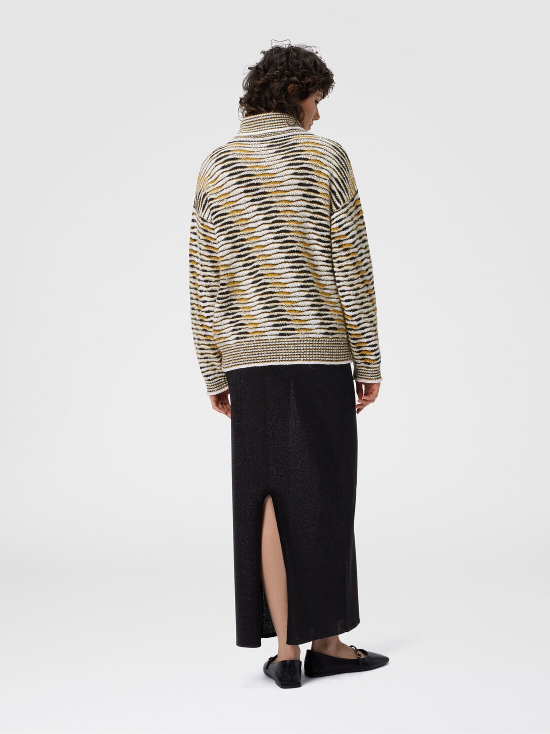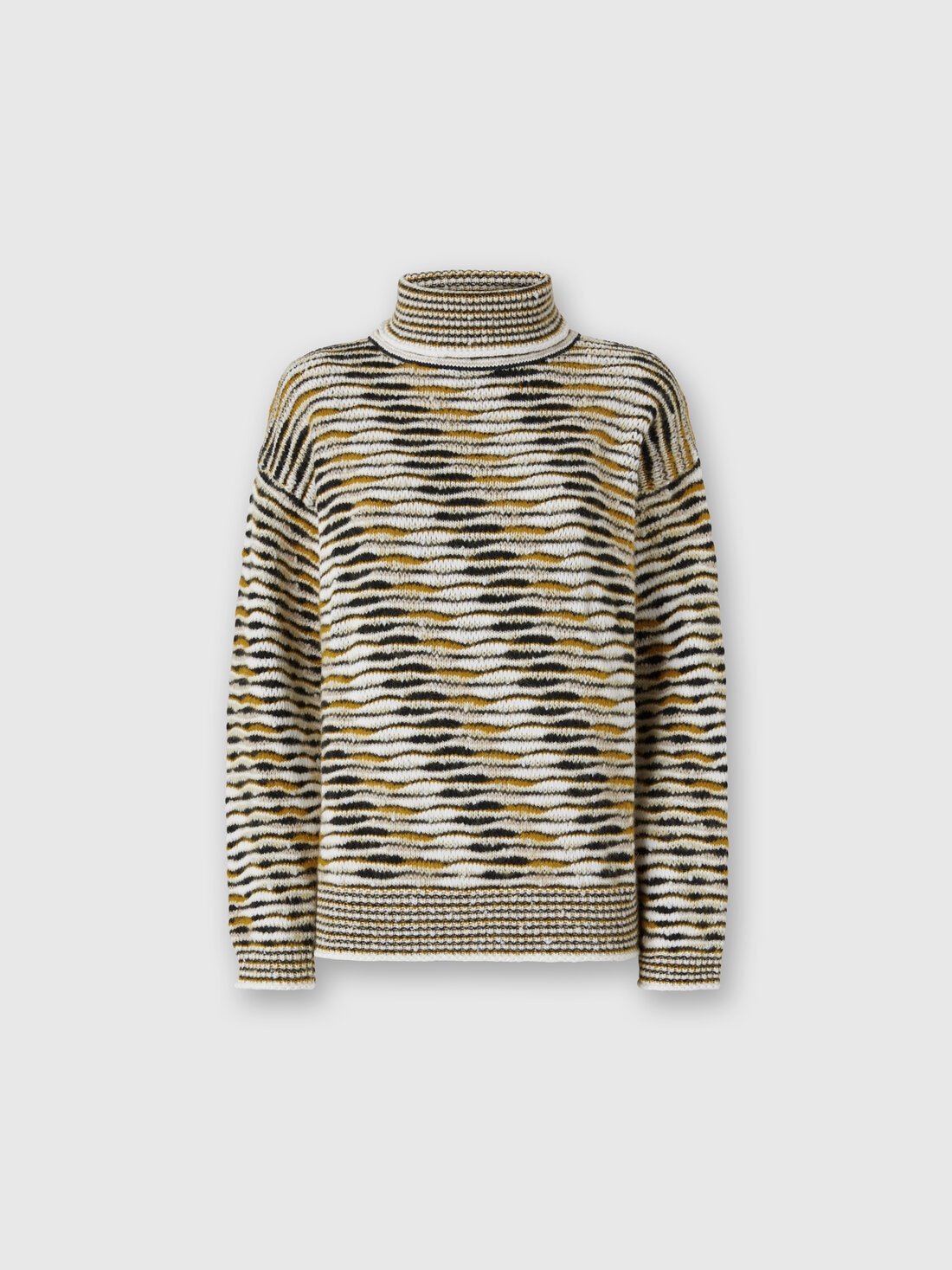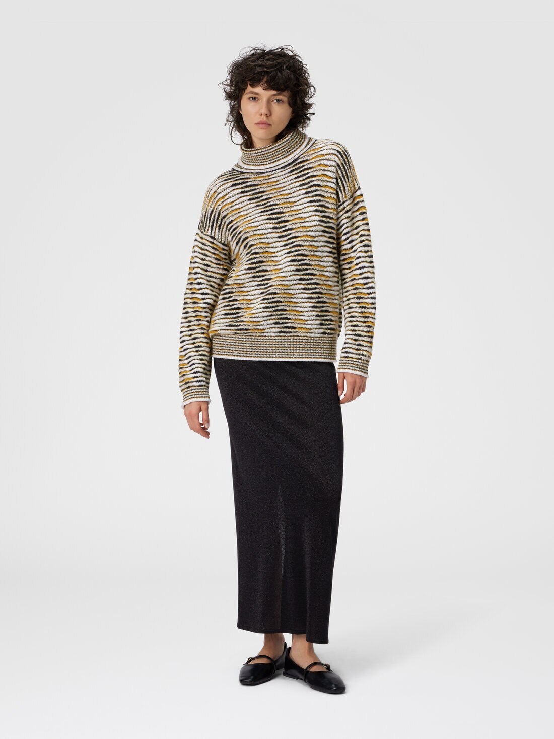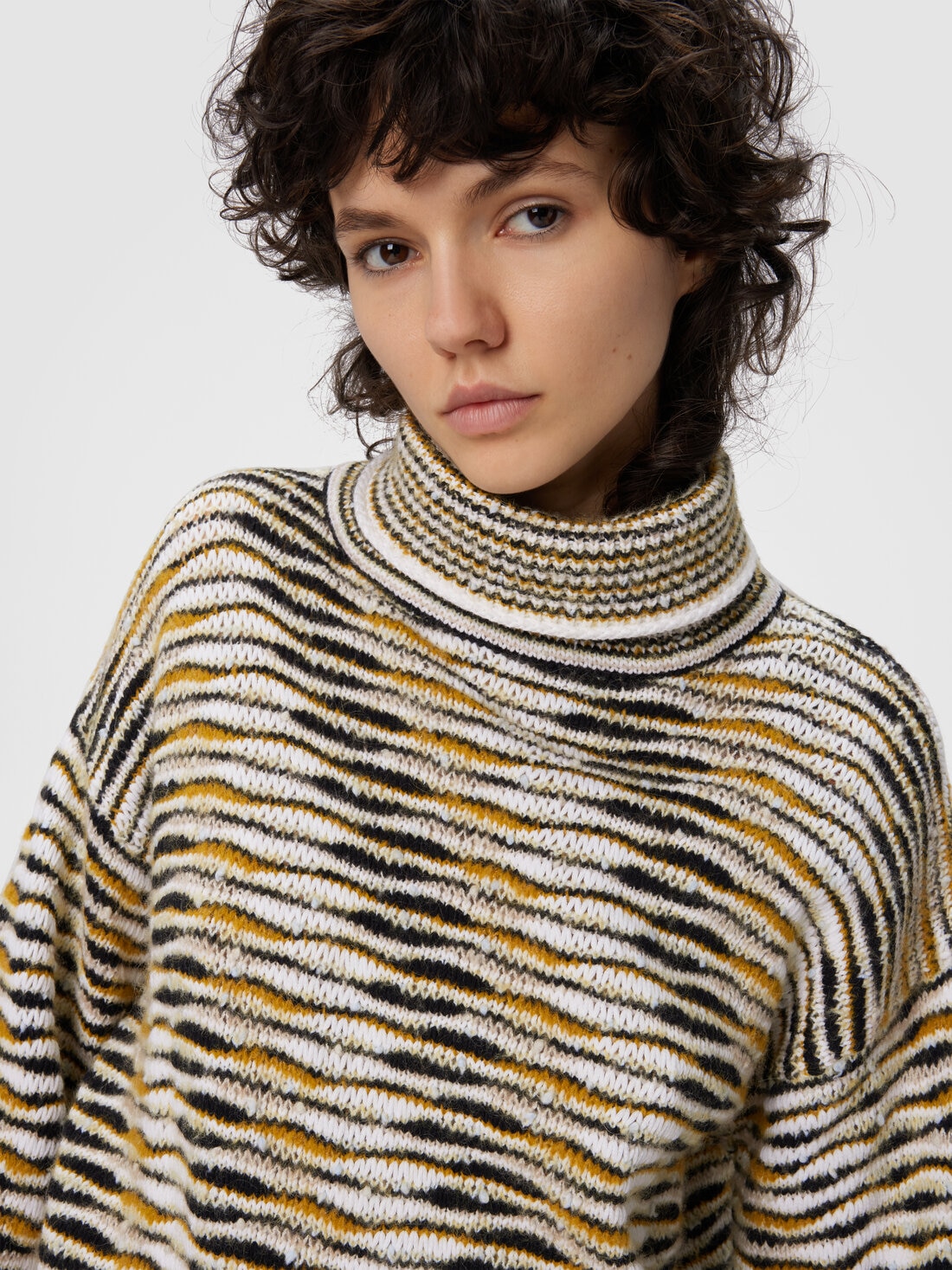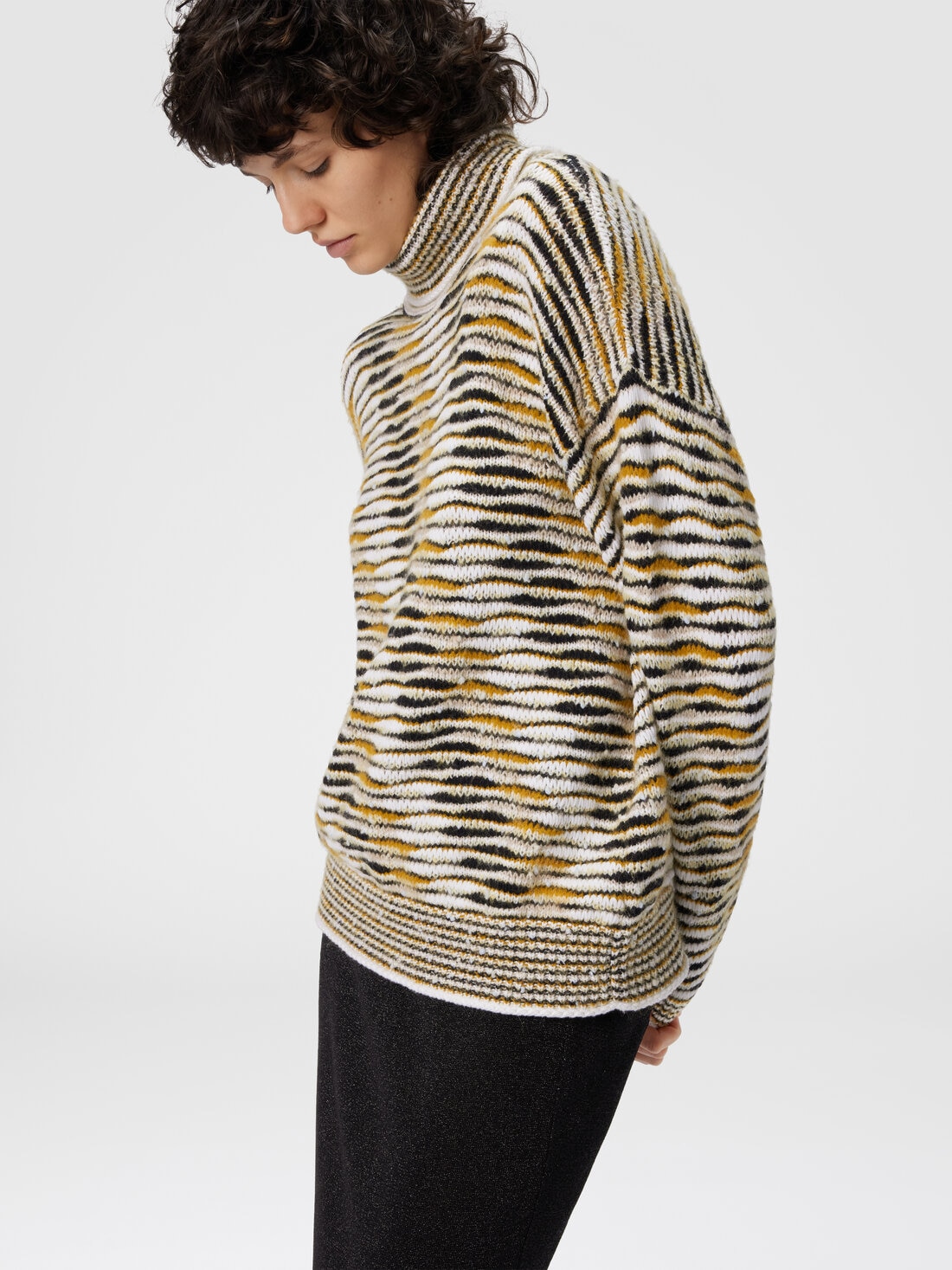 Dieser oversized Rollkragenpullover für Damen aus Baumwollmix überzeugt mit flammiger Struktur – ein klares Zeichen für Missonis textilen Anspruch. Die weite Silhouette vereint Komfort und raffinierte Verarbeitung zu einem Look zwischen Modernität und Eleganz.