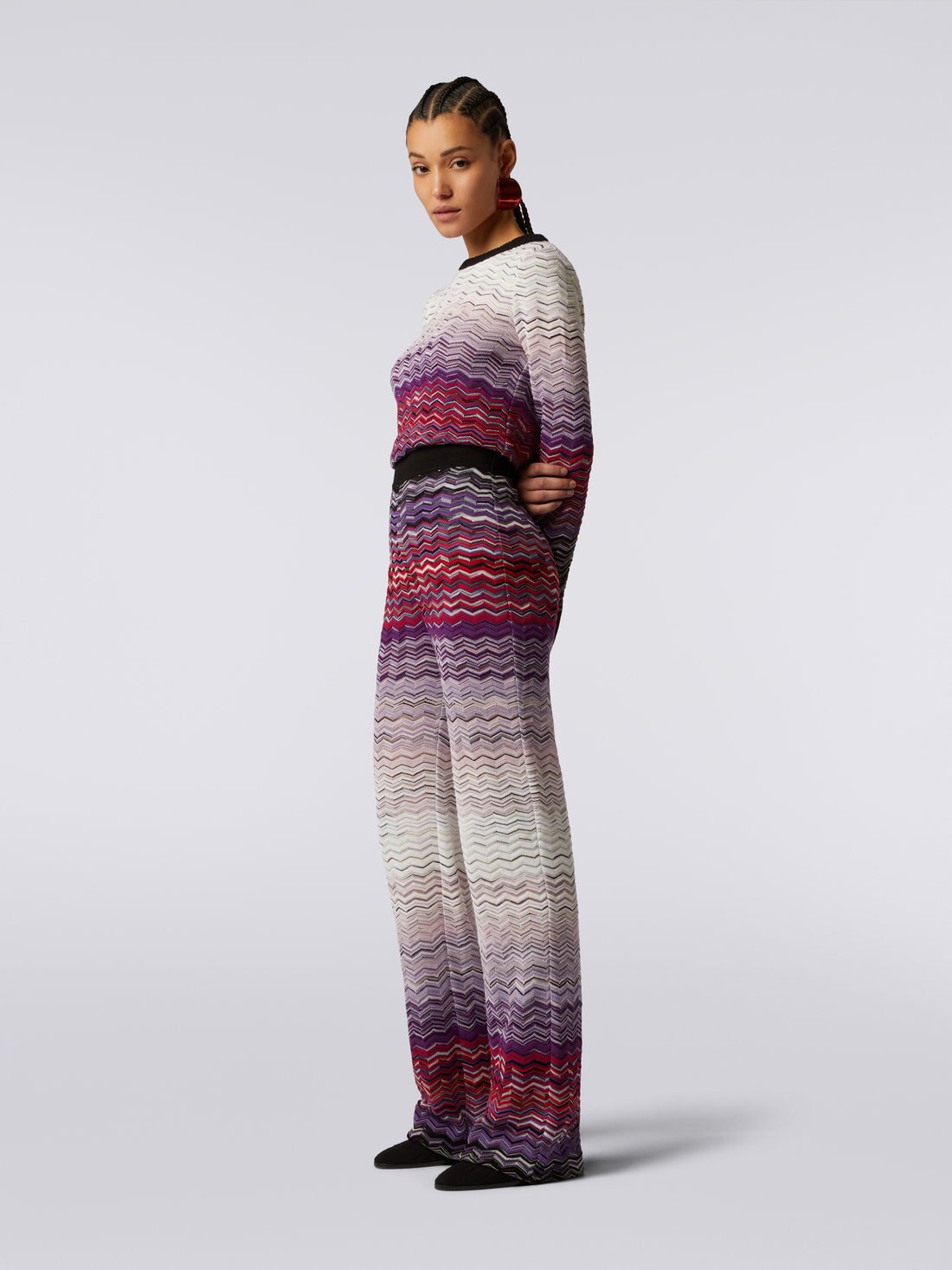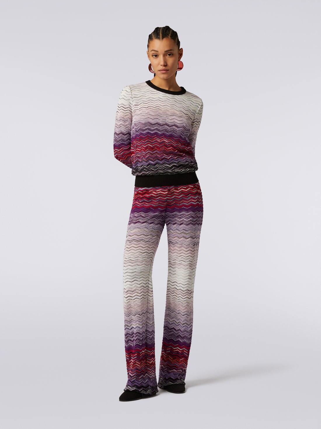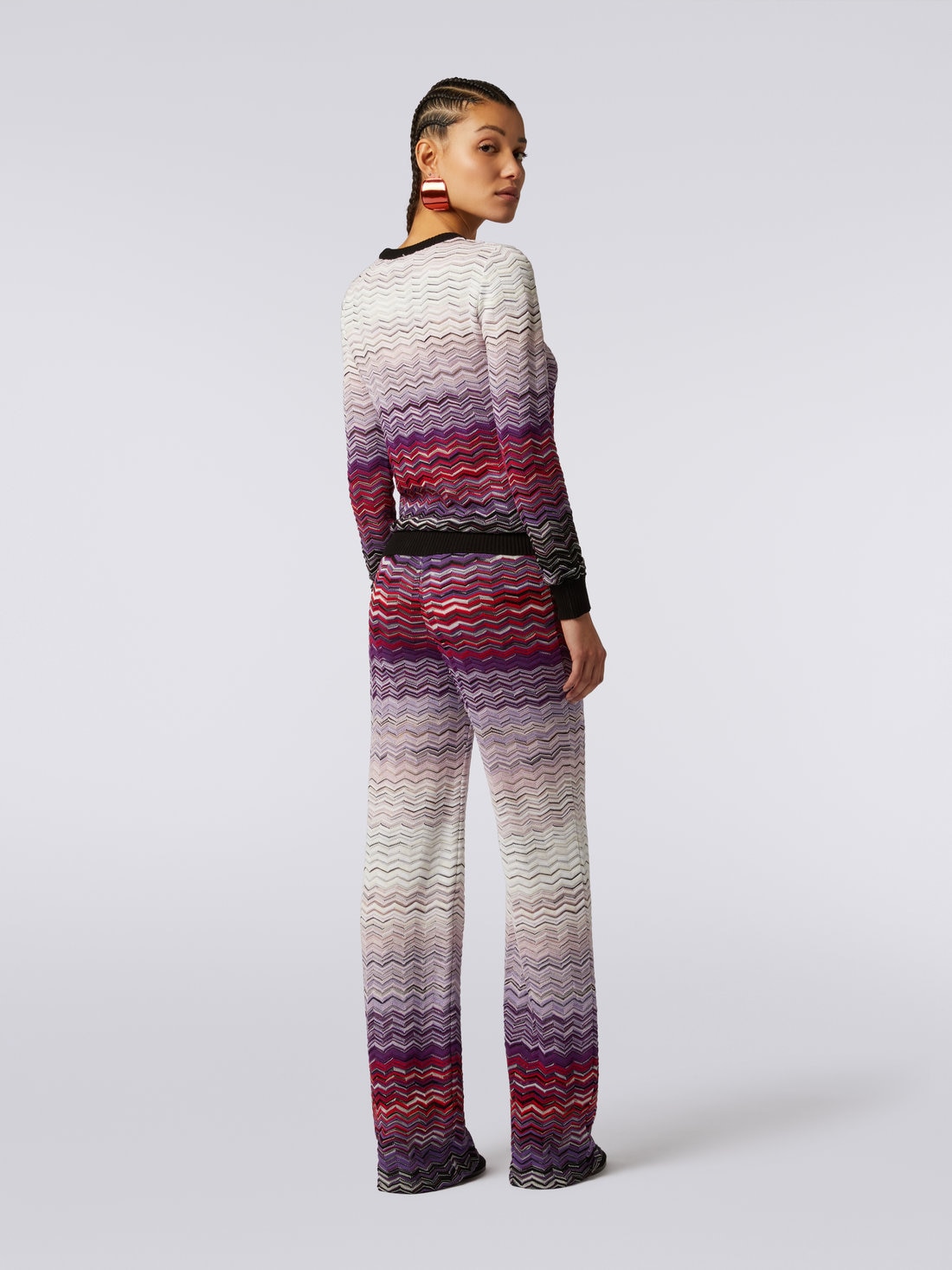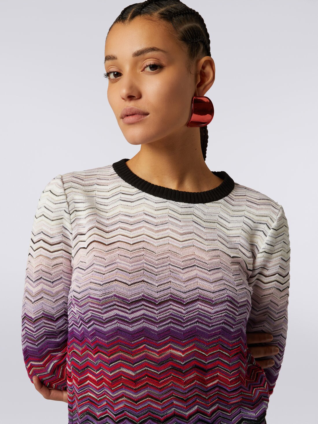 Der dank des Dégradé-Zickzackmusters gekräuselte Damenpullover mit Rundhalsausschnitt ist aus Baumwoll-Viskosestrick gefertigt. Einfarbige Bündchen in Kontrastfarbe vervollständigen das Modell.