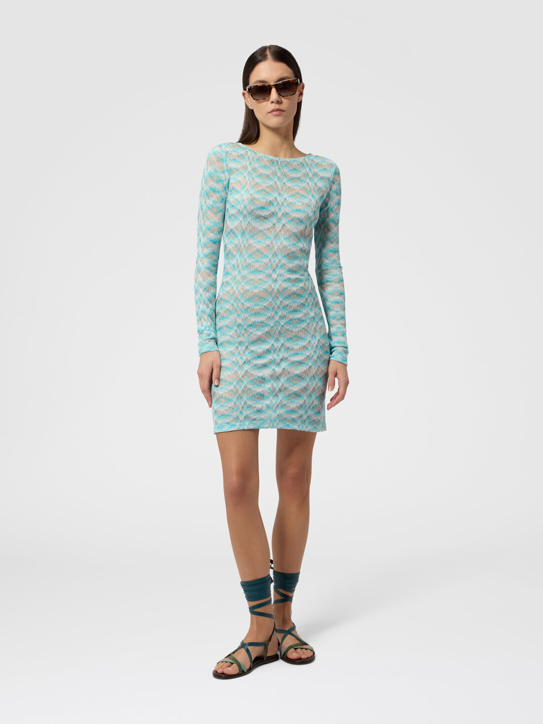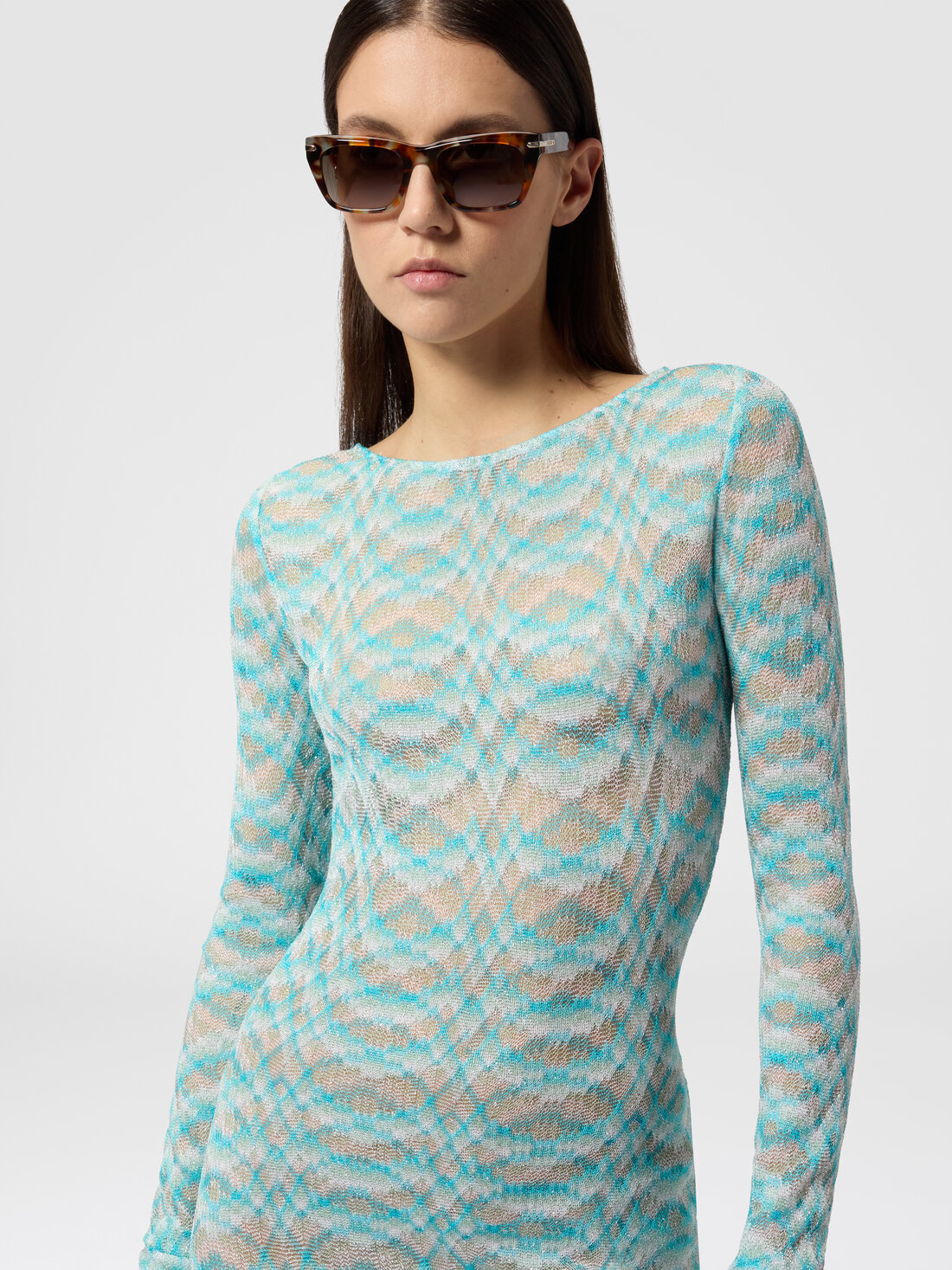 Ein Spiel aus Transparenzen und leuchtenden Details prägt dieses Damen-Minikleid aus schattiertem Viskose-Lamé. Die langen Ärmel und die Raschelverarbeitung verleihen Leichtigkeit und Bewegung und interpretieren den raffinierten Geist Missonis mit Eleganz.