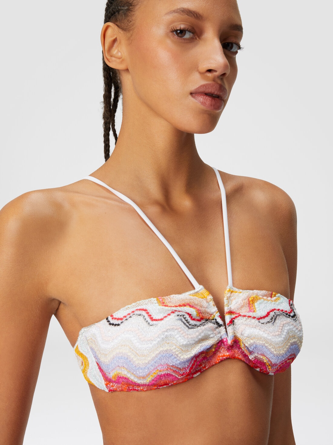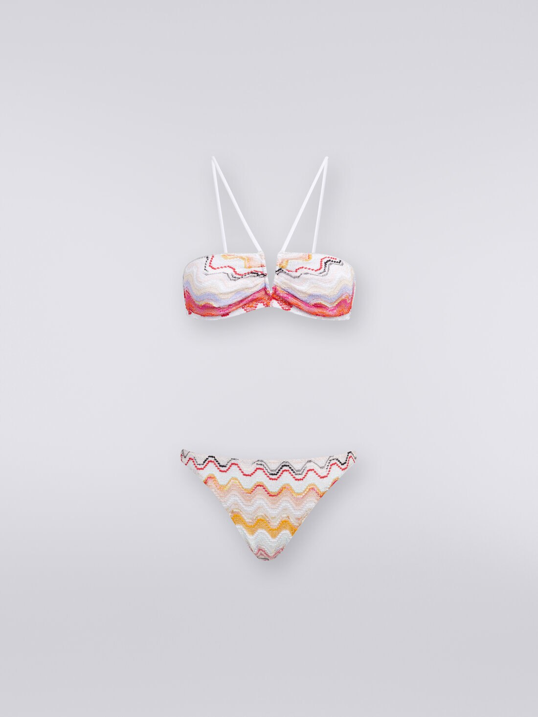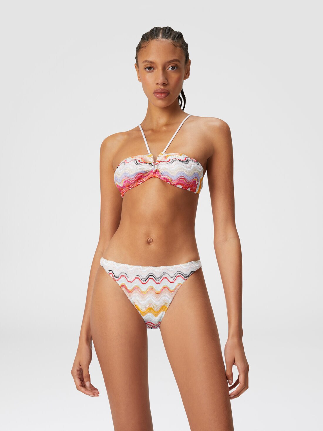 Der Bikini ist aus Mischviskose mit Lurexreflexen gefertigt, das Modell mit Triangel-Oberteil und klassischem Slip stellt eine Kostprobe der eklektischen DNA der Marke dar, bei dem die Maschenware mit Wellenverarbeitung auf das Zickzack-Motiv trifft.