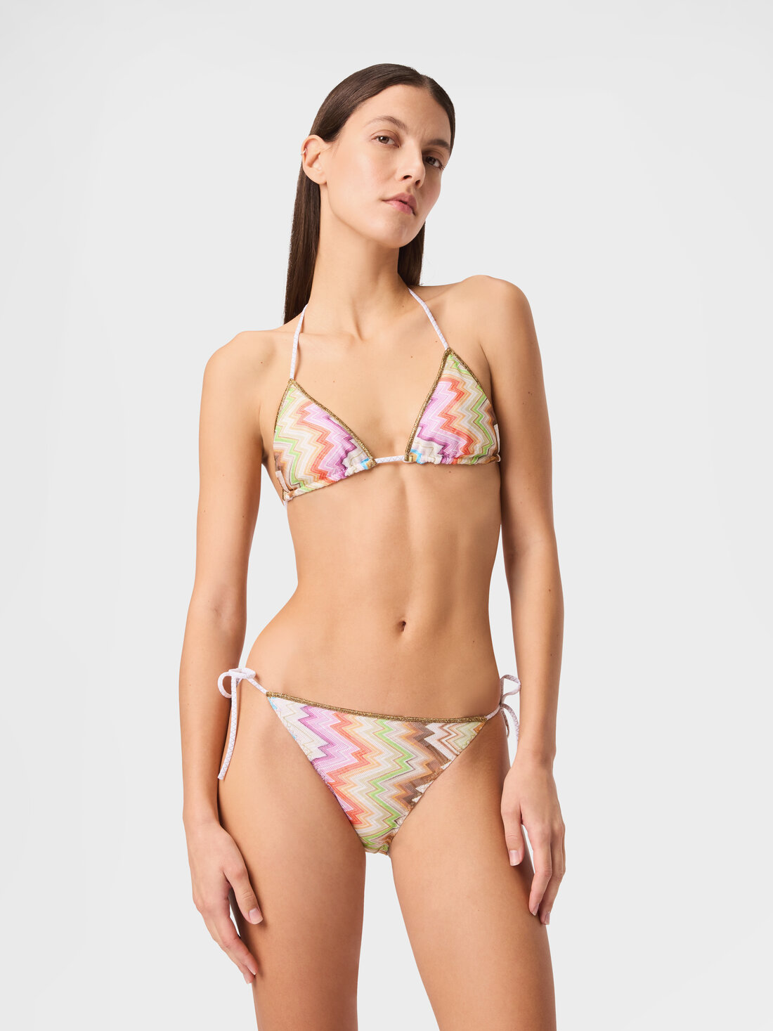 Ein markantes grafisches Zeichen prägt diesen Damen-Bikini, gefertigt in Raschelstrick mit Zickzack-Print und kontrastierenden Abschlüssen. Ein essentielles Modell, das Beachwear mit Persönlichkeit und stilistischer Identität interpretiert.