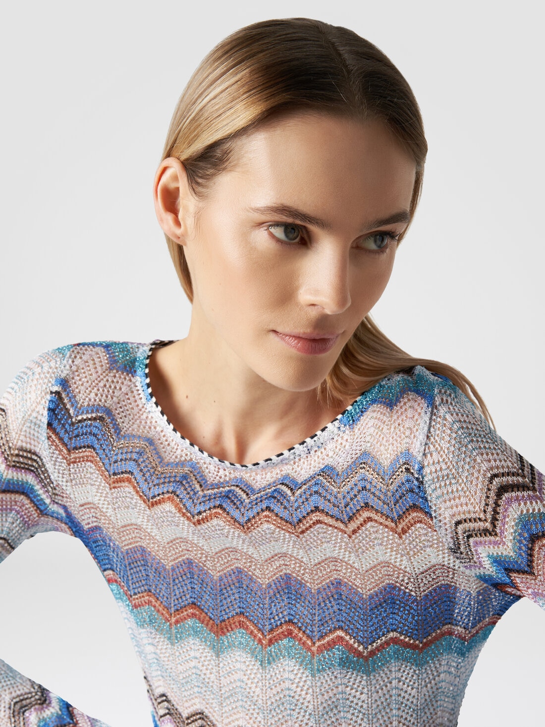 Maschenware mit Häkeleffekt bei dem Strandkleid mit Zickzacklinien und Lurexfäden, die ein Glitzern verleihen. Lange Ärmel und reduzierte Proportionen kennzeichnen dieses Modell mit Rundhalsausschnitt, das perfekt ist, um dem Strandlook eine edle Note zu verleihen.