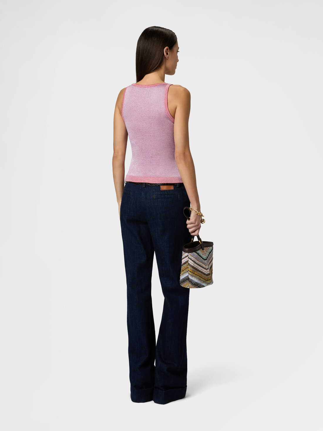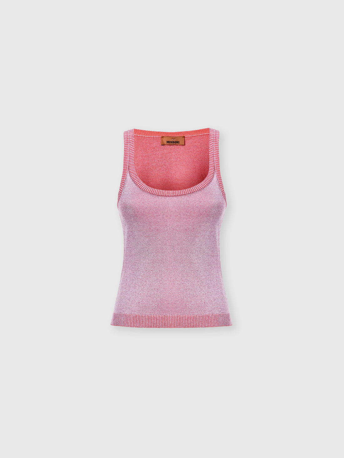 Ein essentielles, aber raffiniertes Damen-Top, gefertigt aus lamébeschichteter Viskosemischung, die dem Strick dezent schimmernde Reflexe verleiht. Die klare, moderne Linie wird durch subtile Details betont, während der sanfte Glanz des Stoffes dem Kleidungsstück die unverwechselbare Missoni-Eleganz verleiht.