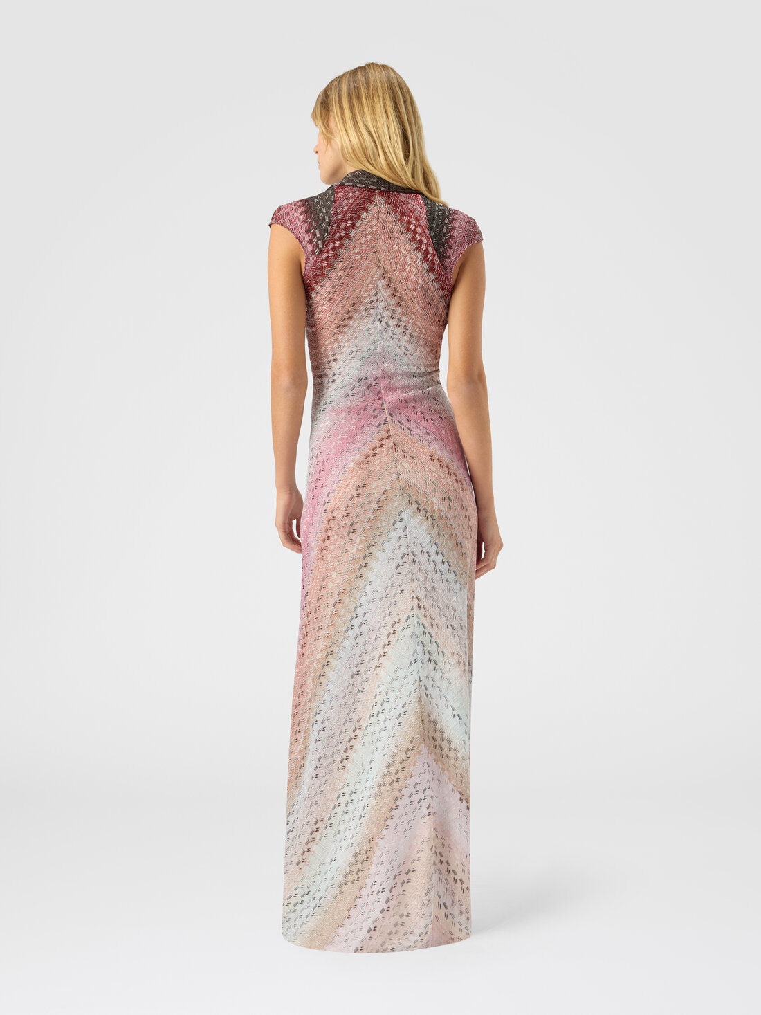 Ein langes, ärmelloses Damenkleid, veredelt durch einen markanten skulpturalen Knoten und einen V-Ausschnitt, der die weibliche Silhouette betont. Die Raschel-Strickarbeit mit versetztem Muster wird durch Lamé-Details bereichert und schafft eine raffinierte Balance zwischen Struktur und Leuchtkraft, ganz im typischen Missoni-Stil.