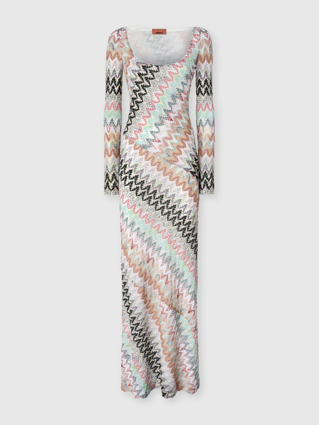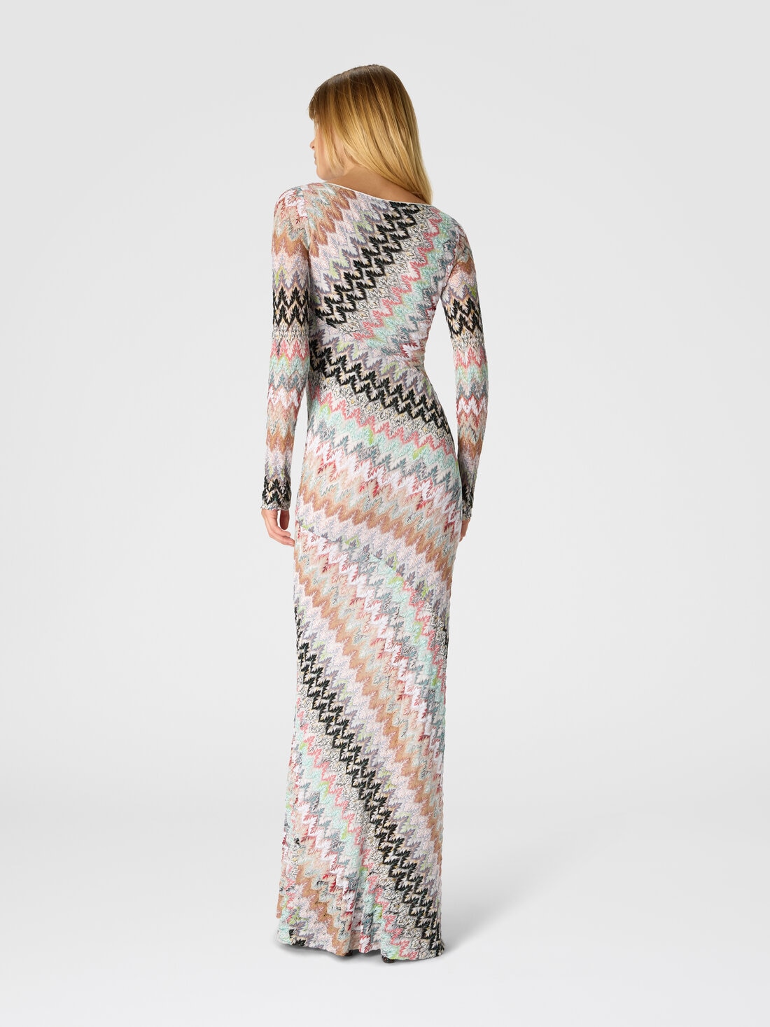 Das handwerkliche Können von Missoni zeigt sich in diesem langen Damenkleid aus Viskose-Lamé und Baumwolle, mit langen Ärmeln und einer aufwendigen Raschel-Spitzenarbeit im Zickzack-Muster. Der Rundhalsausschnitt betont die Reinheit der Linien und die zeitlose Eleganz des Hauses.