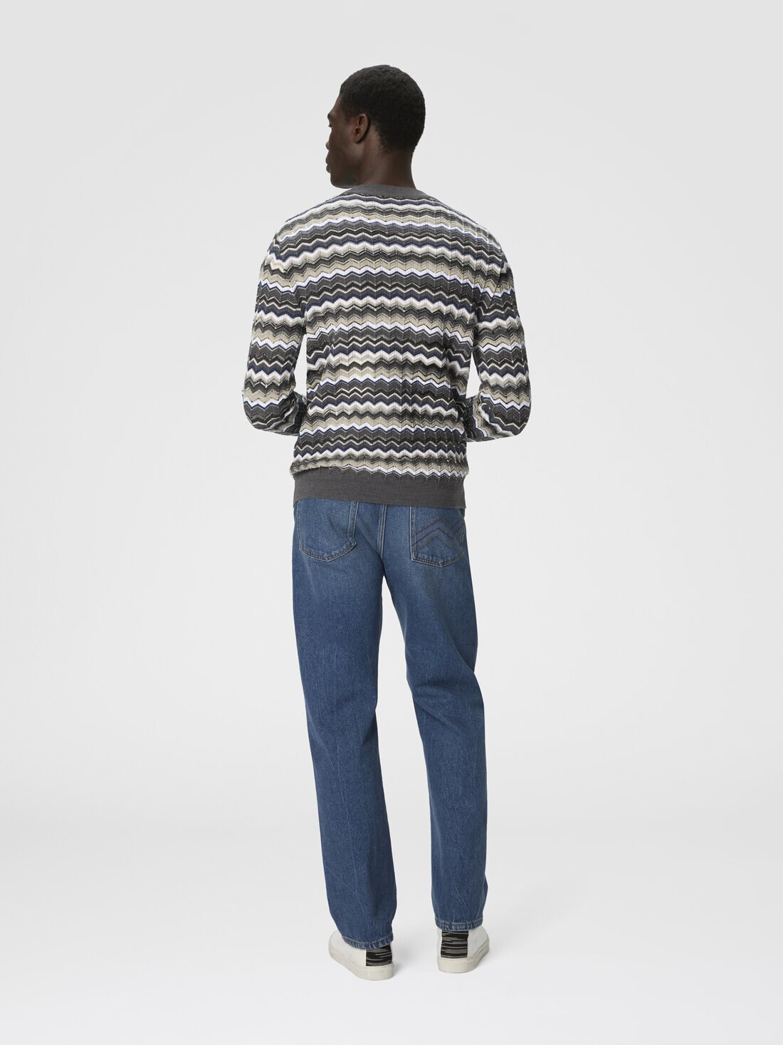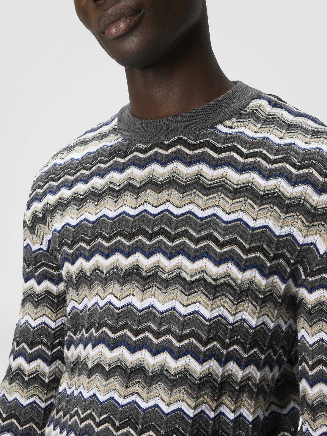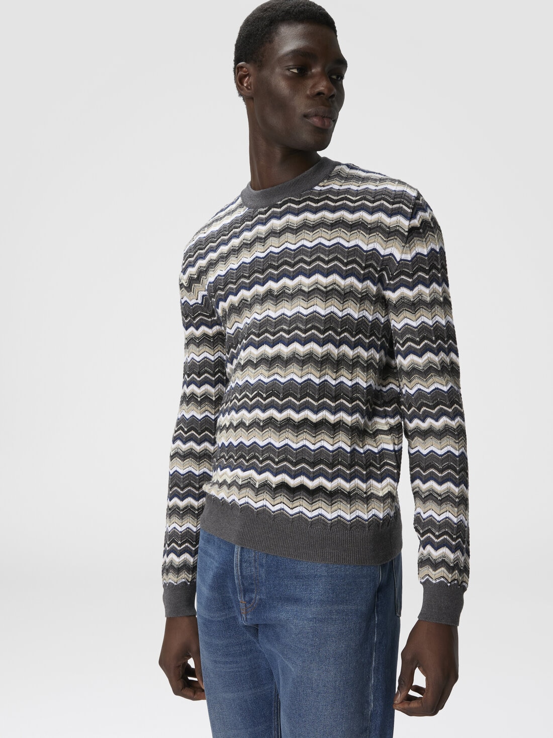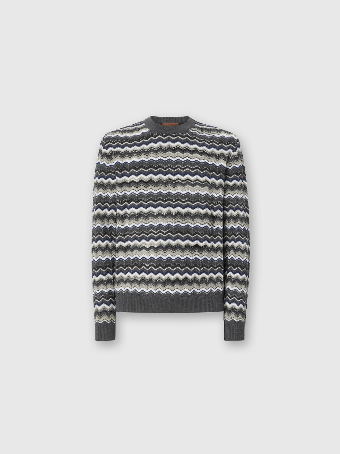 Ein Herrenpullover mit Rundhalsausschnitt aus Woll-Baumwoll-Mix, der mit einem lebendigen Zickzack-Muster Dynamik und Komfort vereint. Ideal für alle, die einen vielseitigen und stilvollen Look mit Wiedererkennungswert suchen.