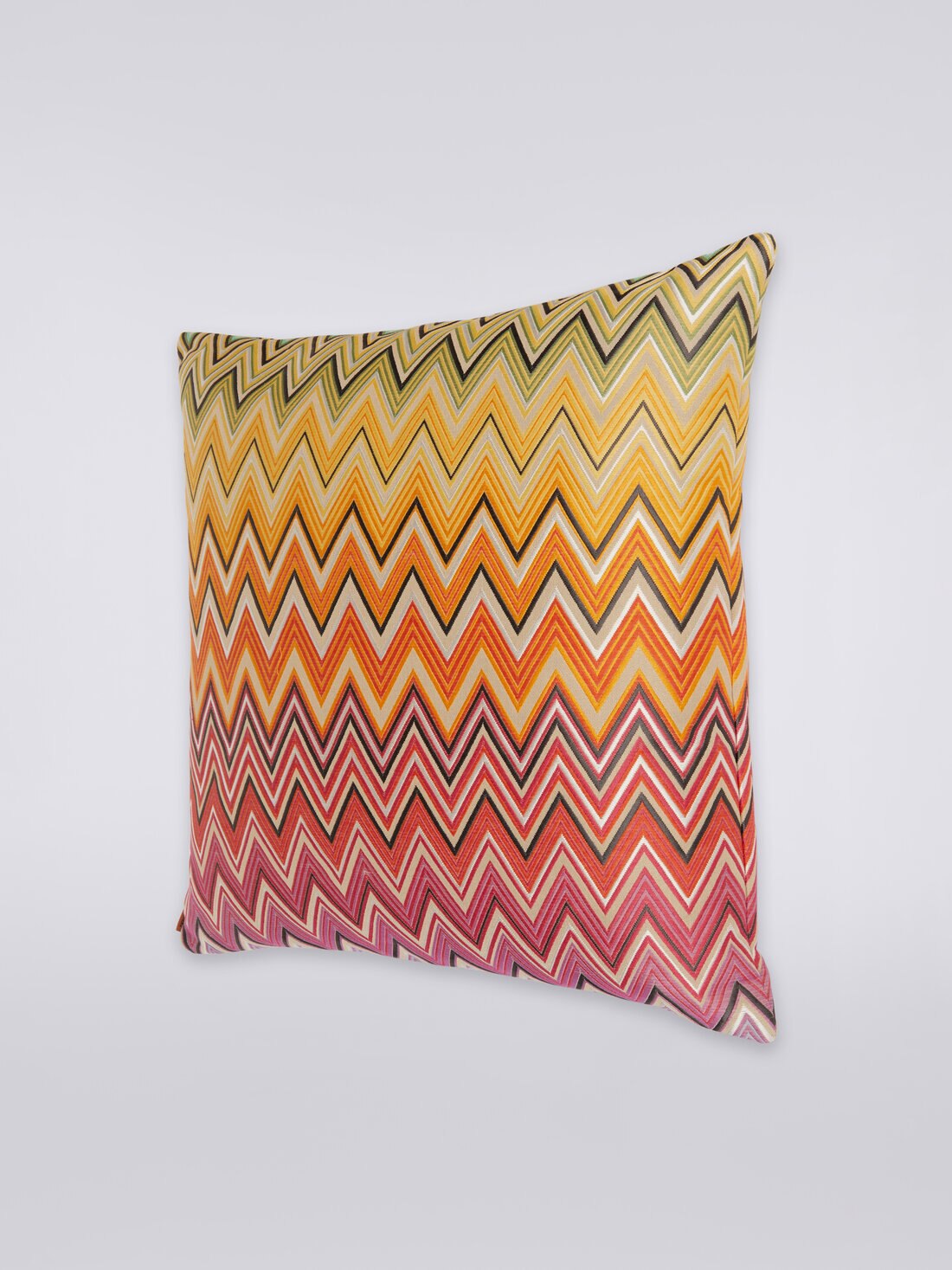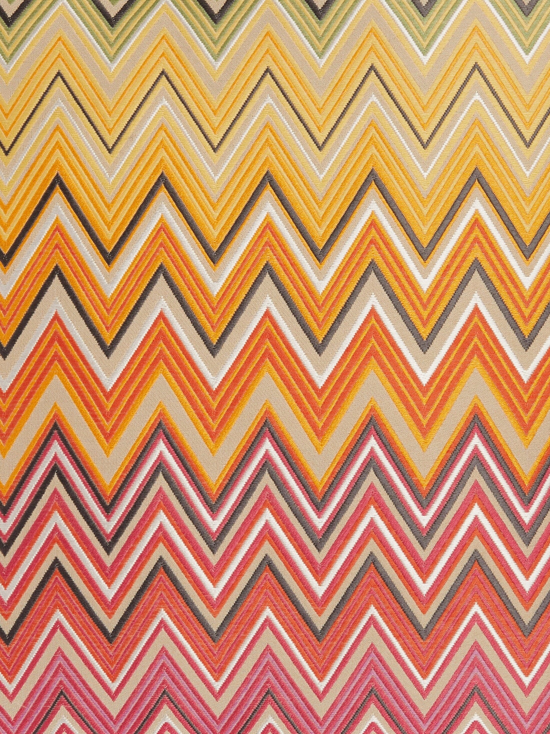 Makroformat für das Kissen Yanai 50x50 cm. Hier kommt die Missoni-DNA dank des Chevron-Motivs auf dem Baumwoll-Canvas mit Seide voll zum Ausdruck. Das Accessoire um Wohn- und Geschäftsräumen Eleganz zu verleihen.