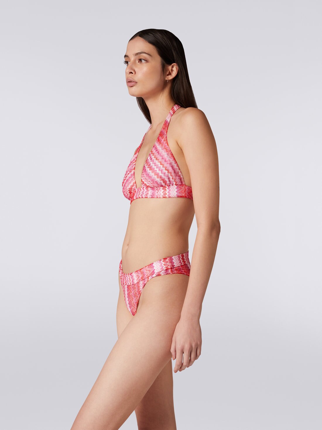 Für diesen Damenbikini von Missoni Chevronmuster und Zickzackstreifen auf verschiedenen Hintergründen, über die sich die Farbe verteilt. Das neue Modell, bestehend aus dem Oberteil, das perfekten Halt bietet, und dem Höschen mit doppeltem Riemchen, verbindet Komfort und Vielseitigkeit mit der unverwechselbaren DNA der Marke.