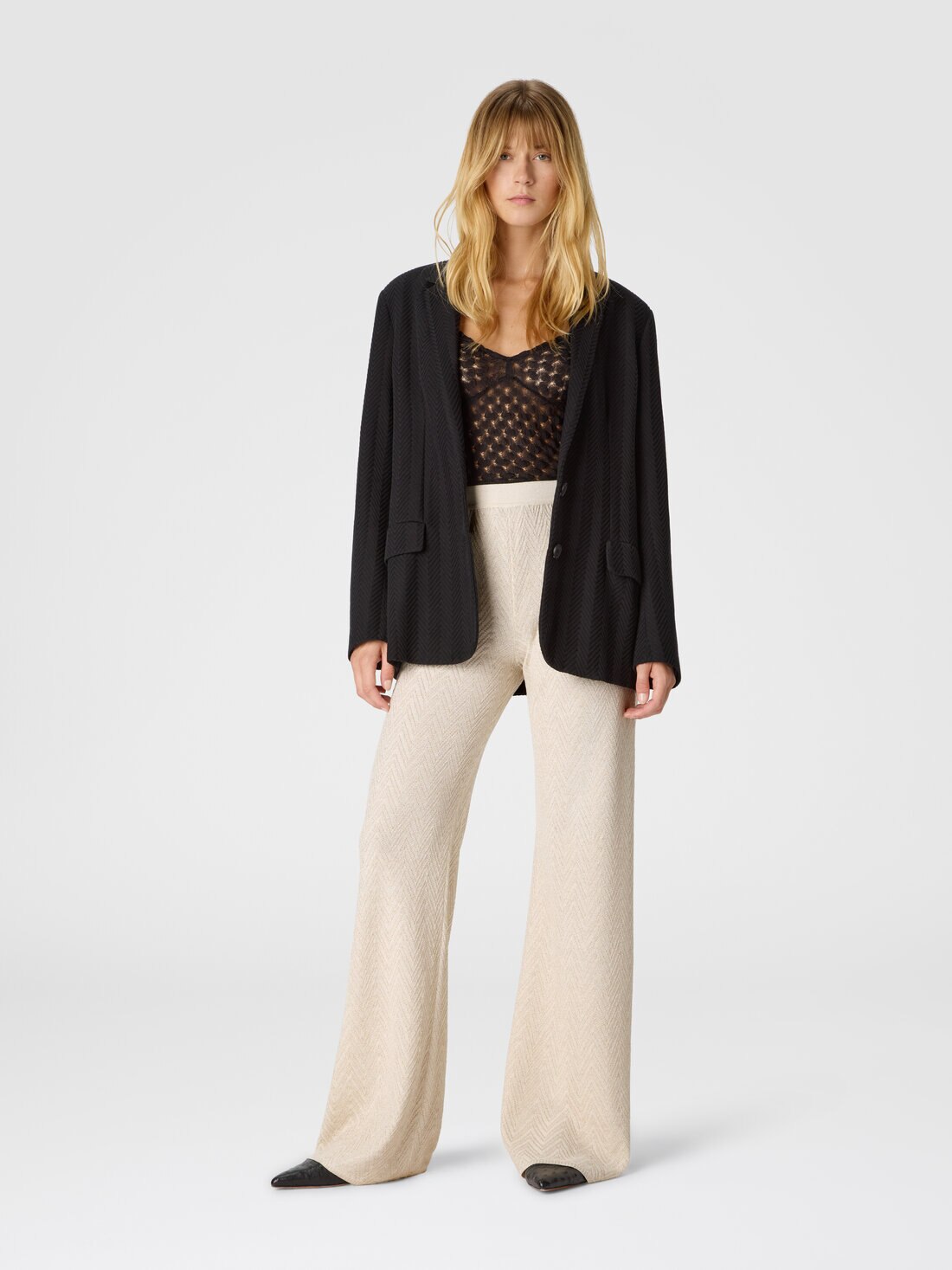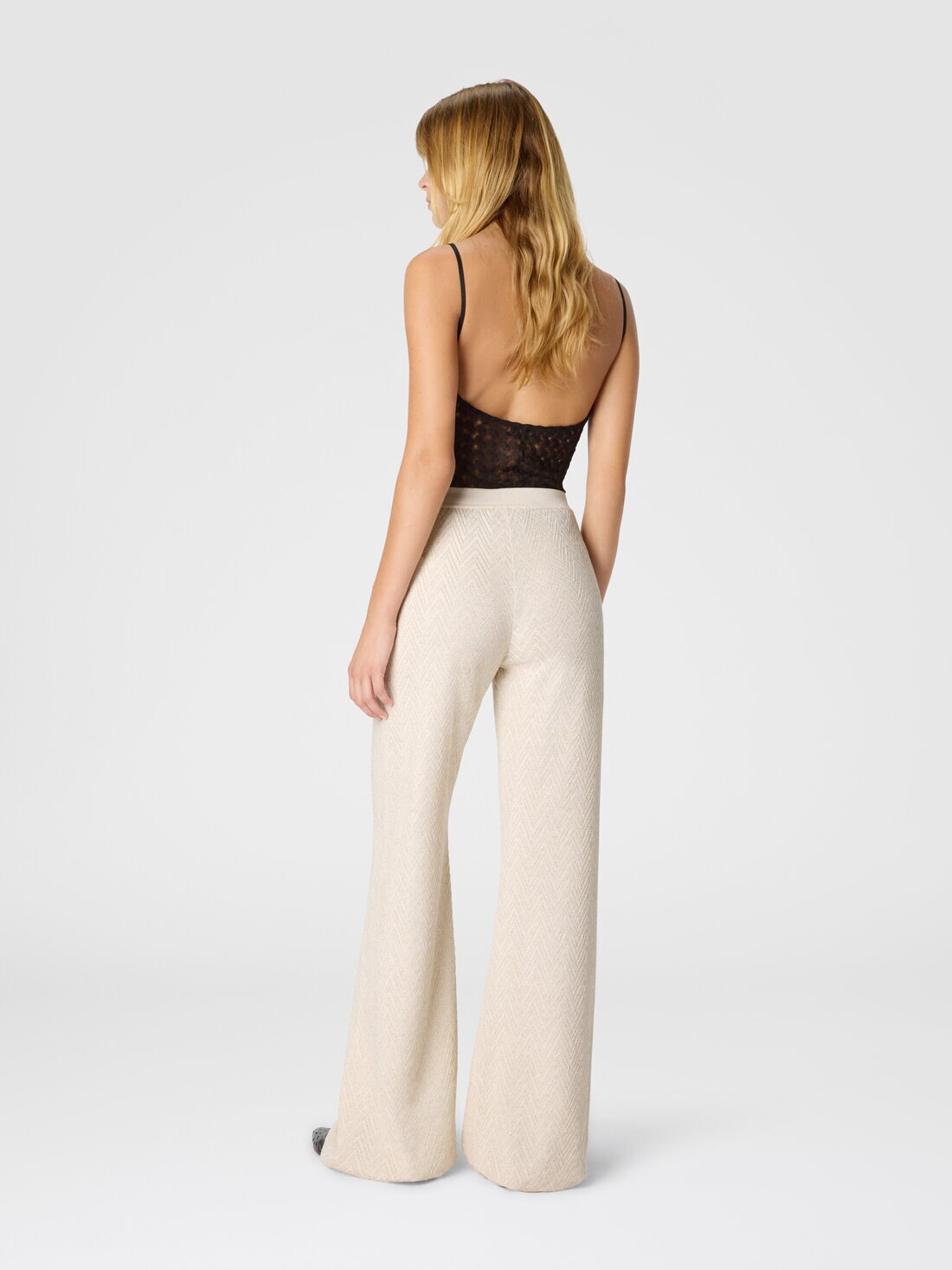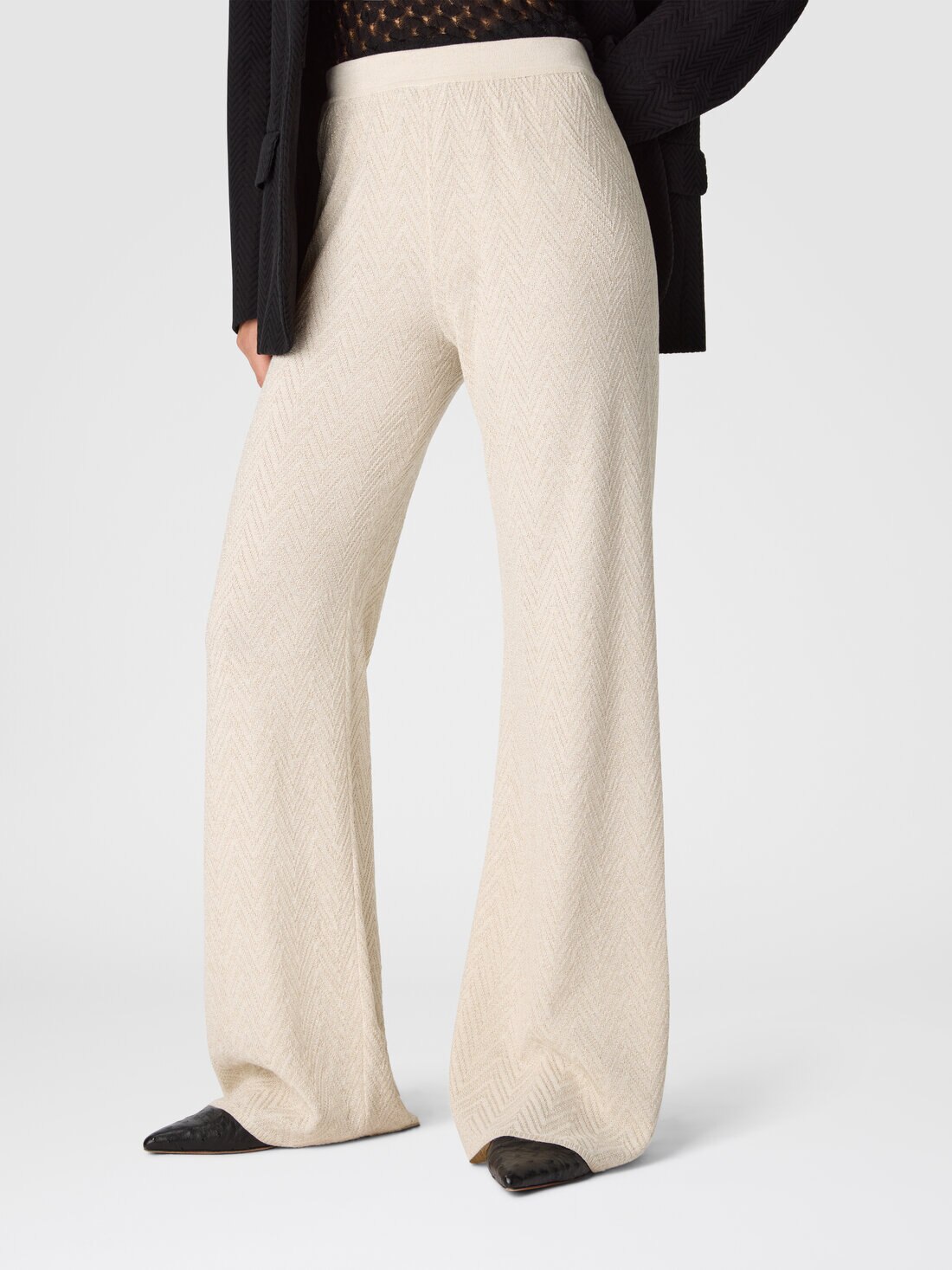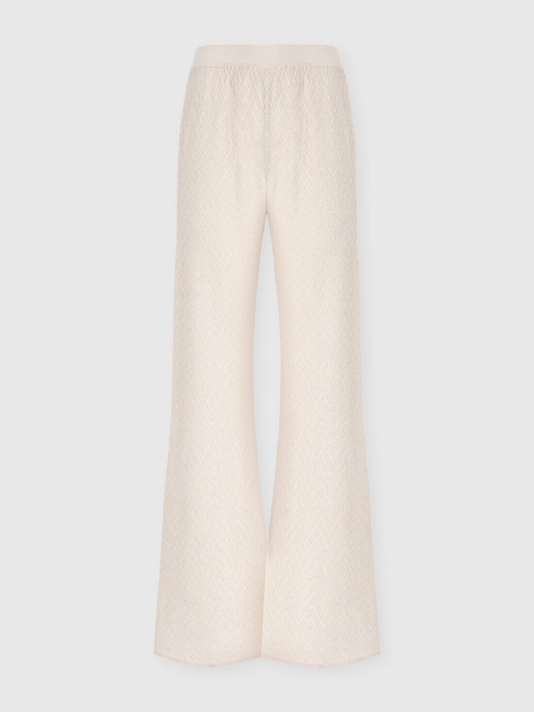 Diese Damenhose mit geradem Schnitt aus einer Mischung aus Baumwolle und Viskose mit Lamé-Fäden verfügt über ein Jacquard-Muster mit Ton-in-Ton-Zickzackmuster, ein charakteristisches Detail des Missoni-Stils.