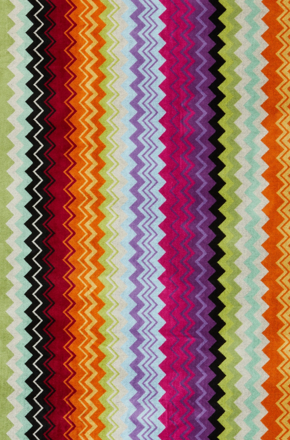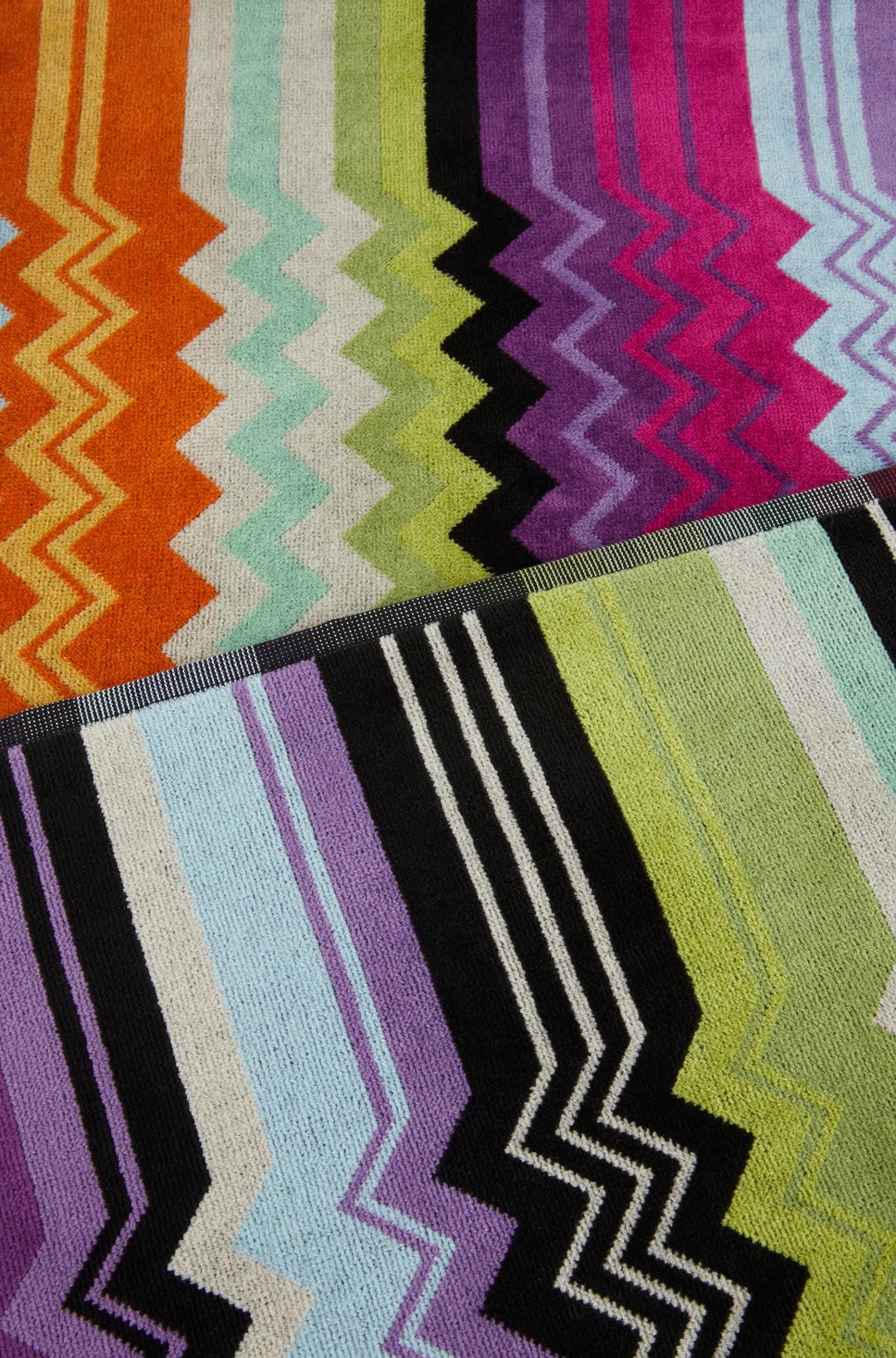 Das Badetuch Giacomo 100x150 cm ist die Quintessenz des Missoni-Stils: Hier trifft die Qualität des Baumwoll-Veloursfrottees auf den Chevron-Print, der in gestreifte Ränder übergeht und dieses schöne und zeitlose Badezimmeraccessoire belebt.