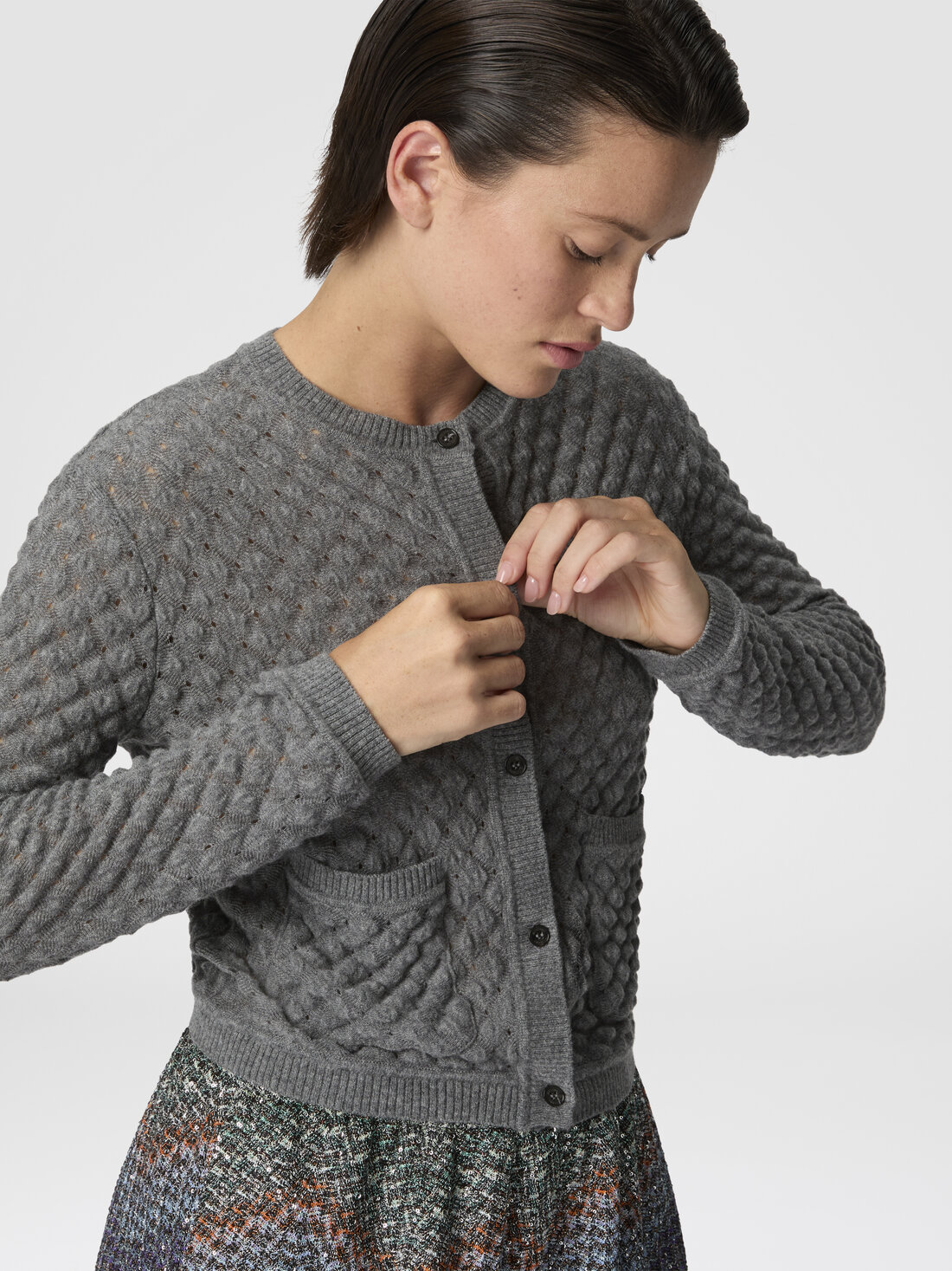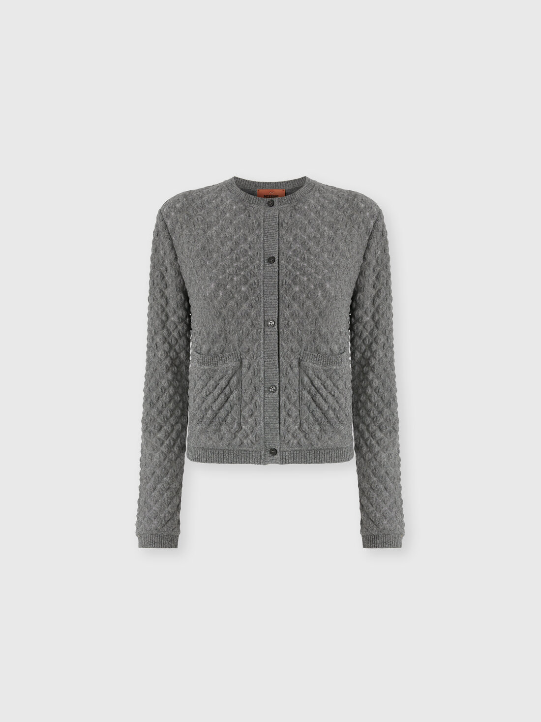 Eine Damenstrickjacke mit anspruchsvollem Flair, gefertigt aus 100% Kaschmir mit Raschelspitze. Der V-Ausschnitt mit Knöpfen und die Fronttaschen unterstreichen die schlichte Linienführung des Modells, während die Kostbarkeit des Garns auf die Leichtigkeit des Gewebes trifft – ein Ausdruck der unverwechselbaren Raffinesse von Missoni.