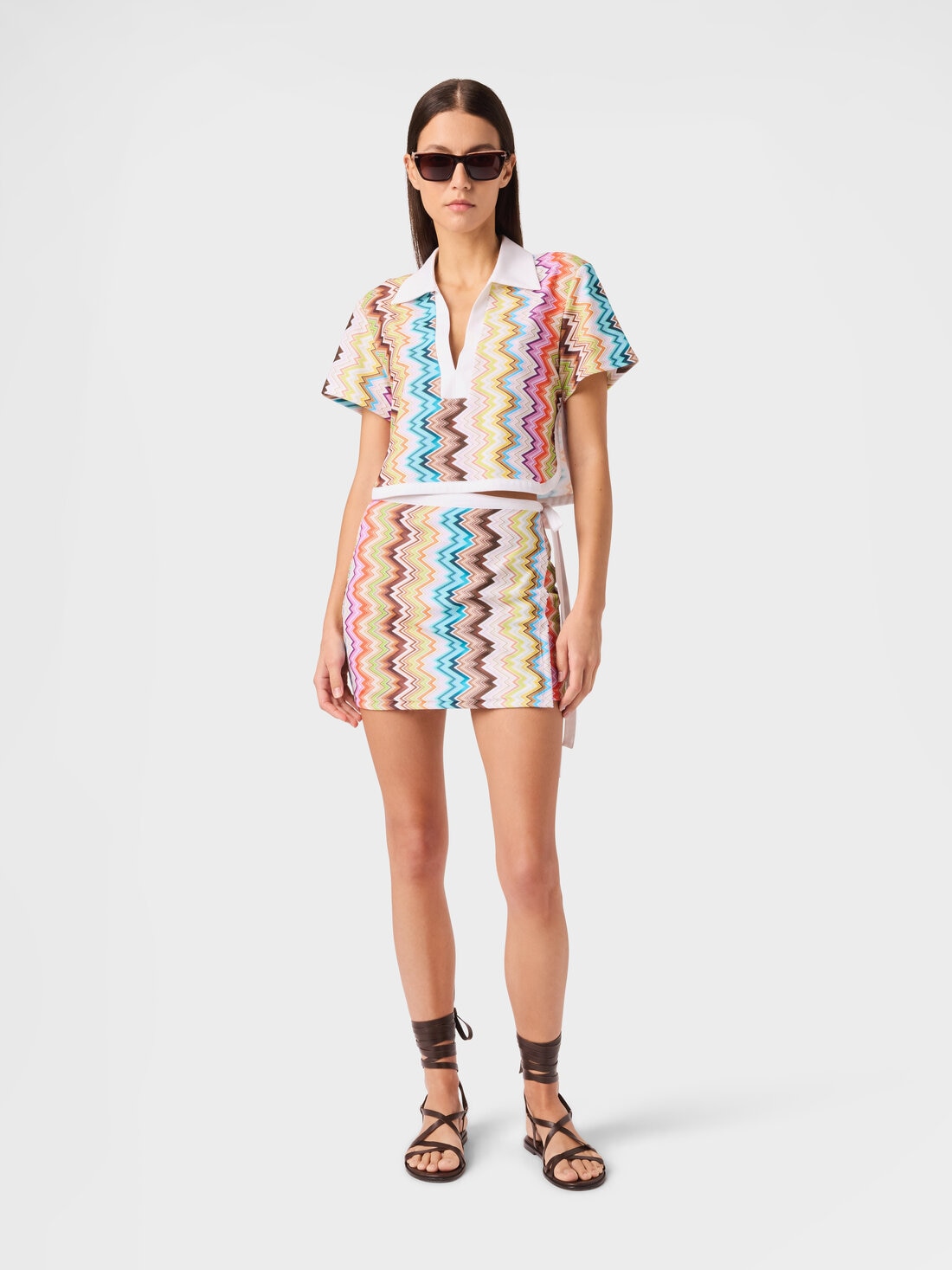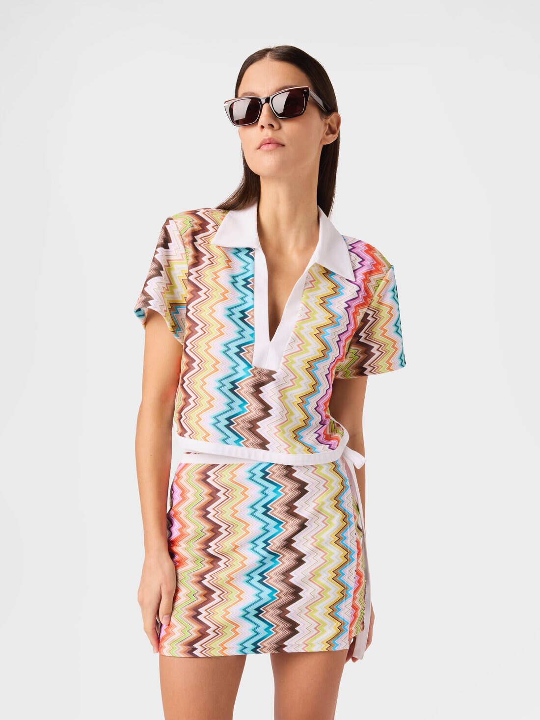 Eine frische Ästhetik mit grafischem Charakter definiert dieses kurze Damen-Poloshirt mit kurzen Ärmeln, v-ausschnitt und kontrastierenden Abschlüssen. Gefertigt aus bedrucktem Frottee mit unregelmäßigem Zickzackmotiv, vereint es Komfort und stilistische Identität.