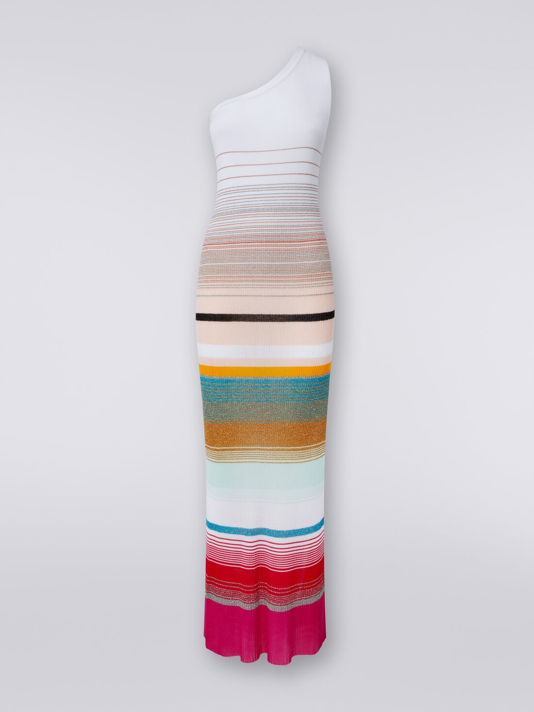 Das lange Ein-Schulter-Kleid ist aus Viskose gefertigt und wird durch einen langen Zug horizontaler Streifen auf verschiedenen Hintergründen mit Lurex-Akzenten belebt. Das auch durch den Rippenstrick besonders körperbetonte Modell mit Seitenschlitz liegt eng an wie eine zweite Haut.