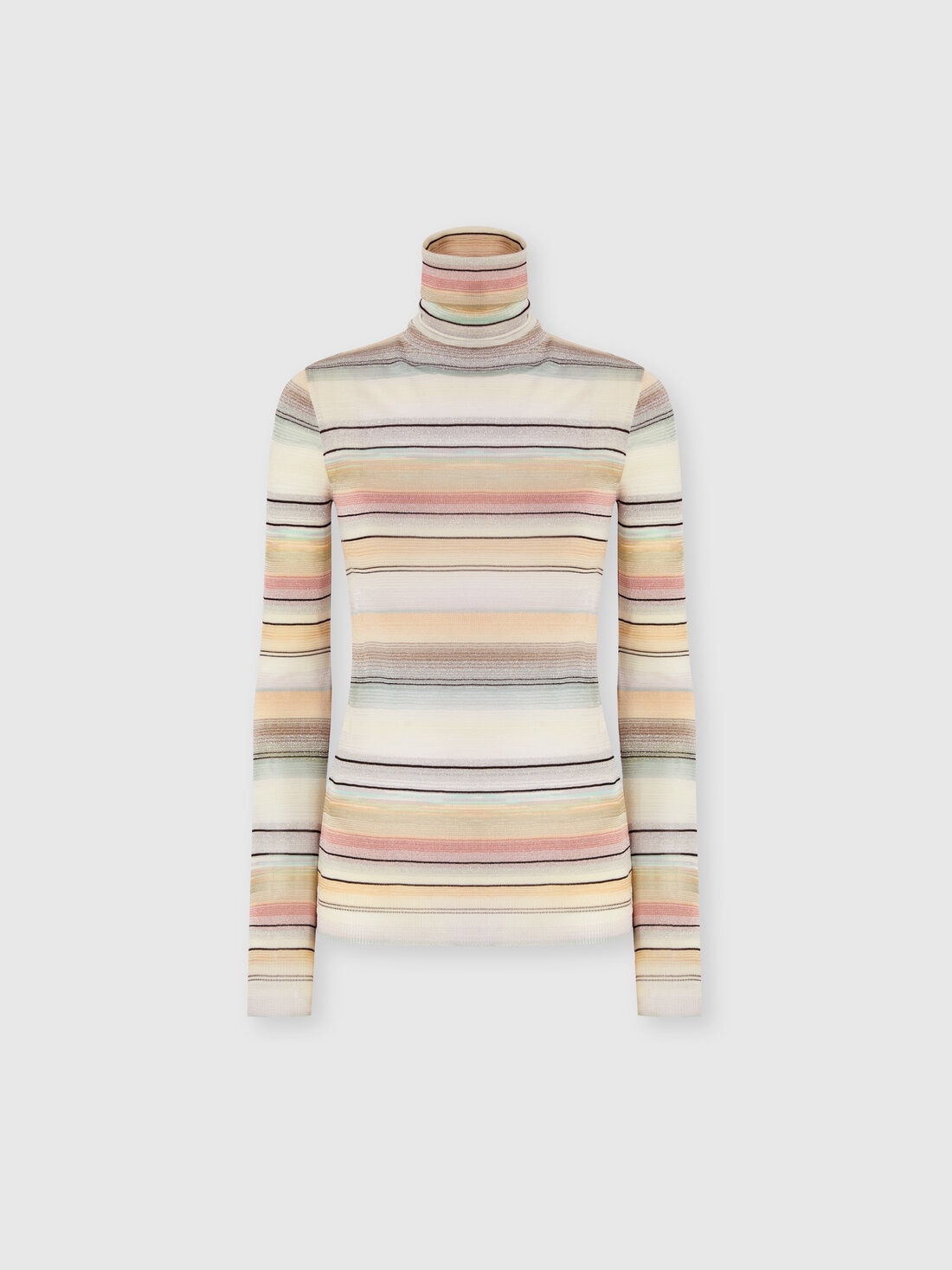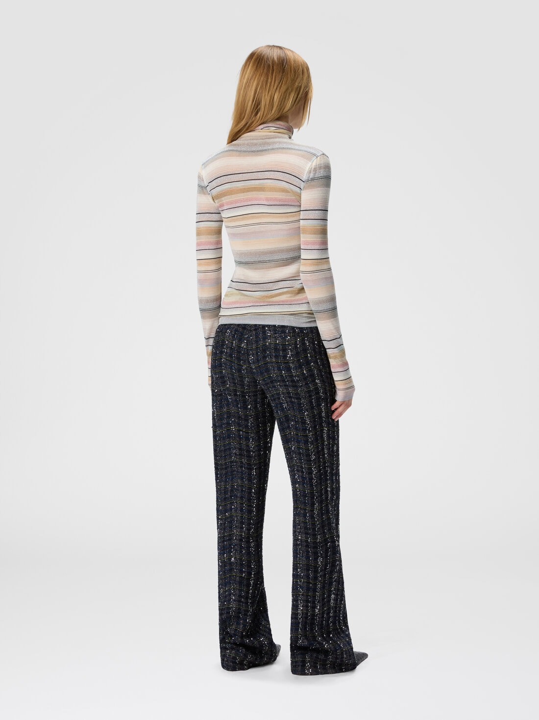 Ein Vorschlag, der Strick mit einem modernen Ansatz neu interpretiert und sich an diejenigen richtet, die Balance zwischen Schlichtheit und Charakter suchen. Dieser Damen-Stehkragenpullover wird aus Woll-Viskose-Mischung mit Lamé-Fäden gefertigt, die die Oberfläche in feinen, subtilen Streifen durchziehen. Die fließende Konstruktion und die glänzende Textur drücken das Know-how von Missoni aus und schaffen ein Kleidungsstück, das Komfort, Stil und Identität in einem grafischen, entschiedenen Statement vereint.