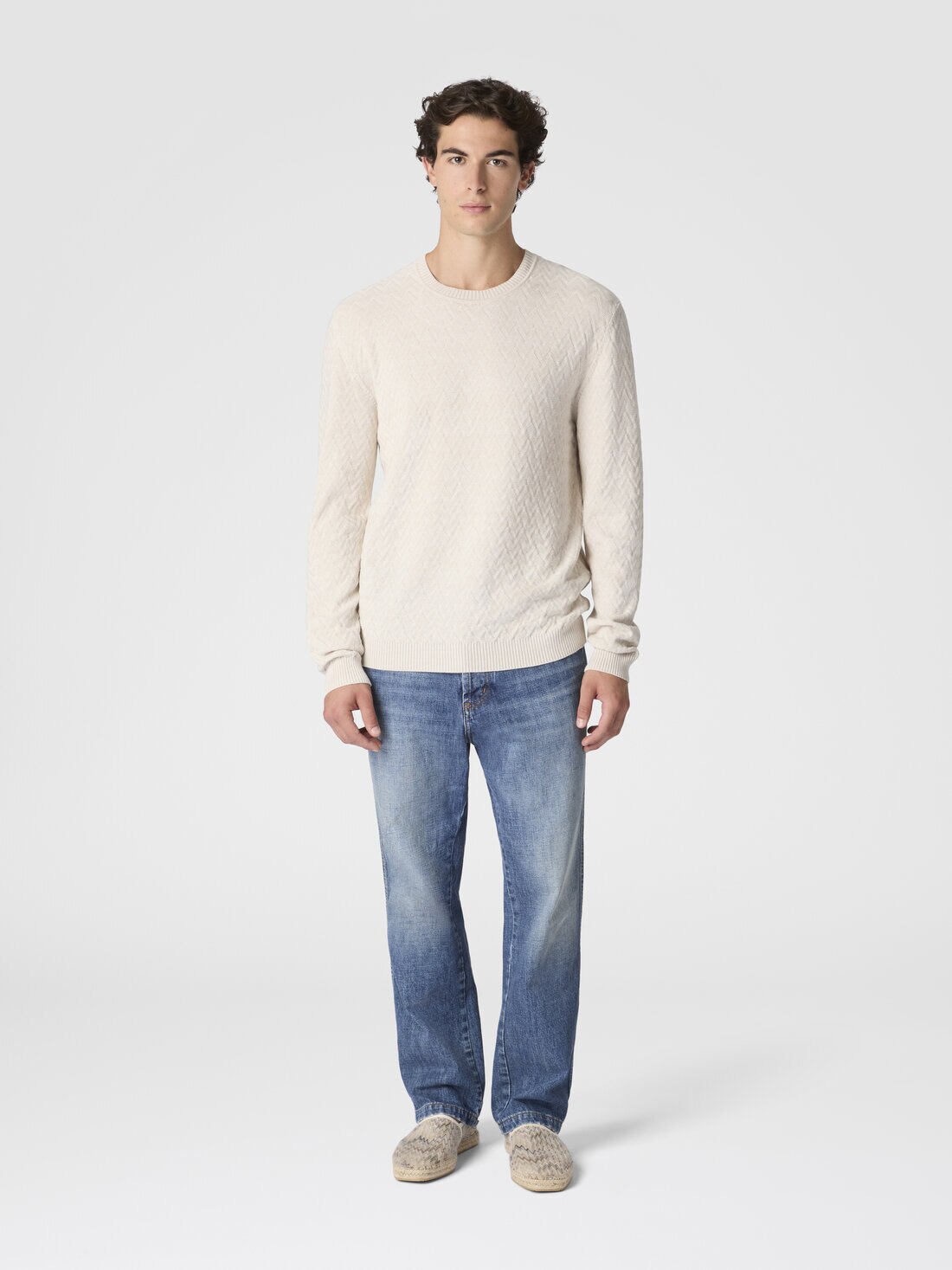 Rundhalspullover aus Wolle und Baumwolle mit Ton-in-Ton-Zickzackmuster