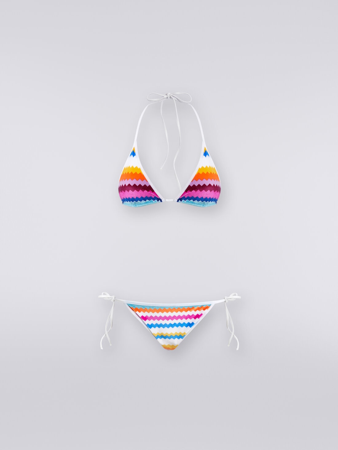 Frottee aus Stretch-Nylon mit Zickzack-Print für den poppigen Bikini. Der Zweiteiler mit Triangel-Oberteil und geschnürtem Slip mit einfarbiger Paspel unterstreicht die sportlich-freche Seite dieses vielseitigen und trendigen Bikinis.