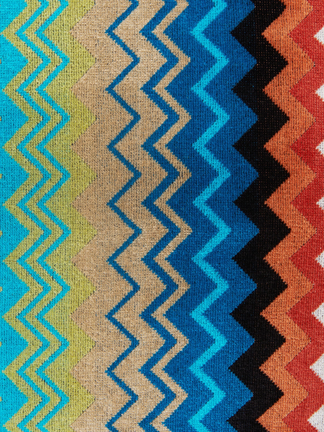 Das Badetuch Giacomo 100x150 cm ist die Quintessenz des Missoni-Stils: Hier trifft die Qualität des Baumwoll-Veloursfrottees auf den Chevron-Print, der in gestreifte Ränder übergeht und dieses schöne und zeitlose Badezimmeraccessoire belebt.