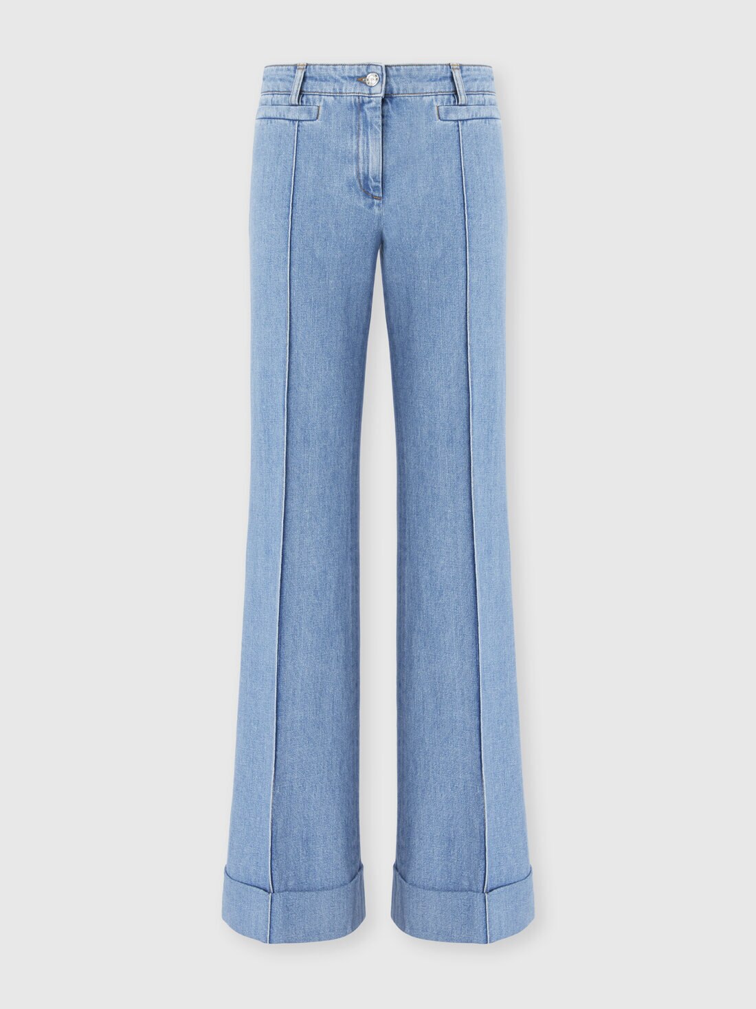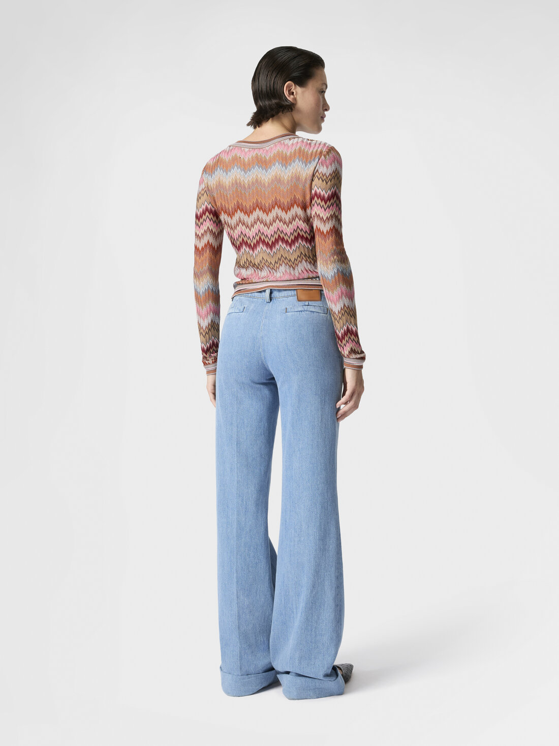 Ein authentischer Ausdruck von Missonis raffinierter Schneiderkunst: Diese ausgestellte Damenjeans aus reinem Baumwoll-Denim zeichnet sich durch umgeschlagene Säume, eine mittige Bügelfalte, die die Silhouette betont, und ein Logoetikett aus, das die Identität des Hauses unterstreicht.