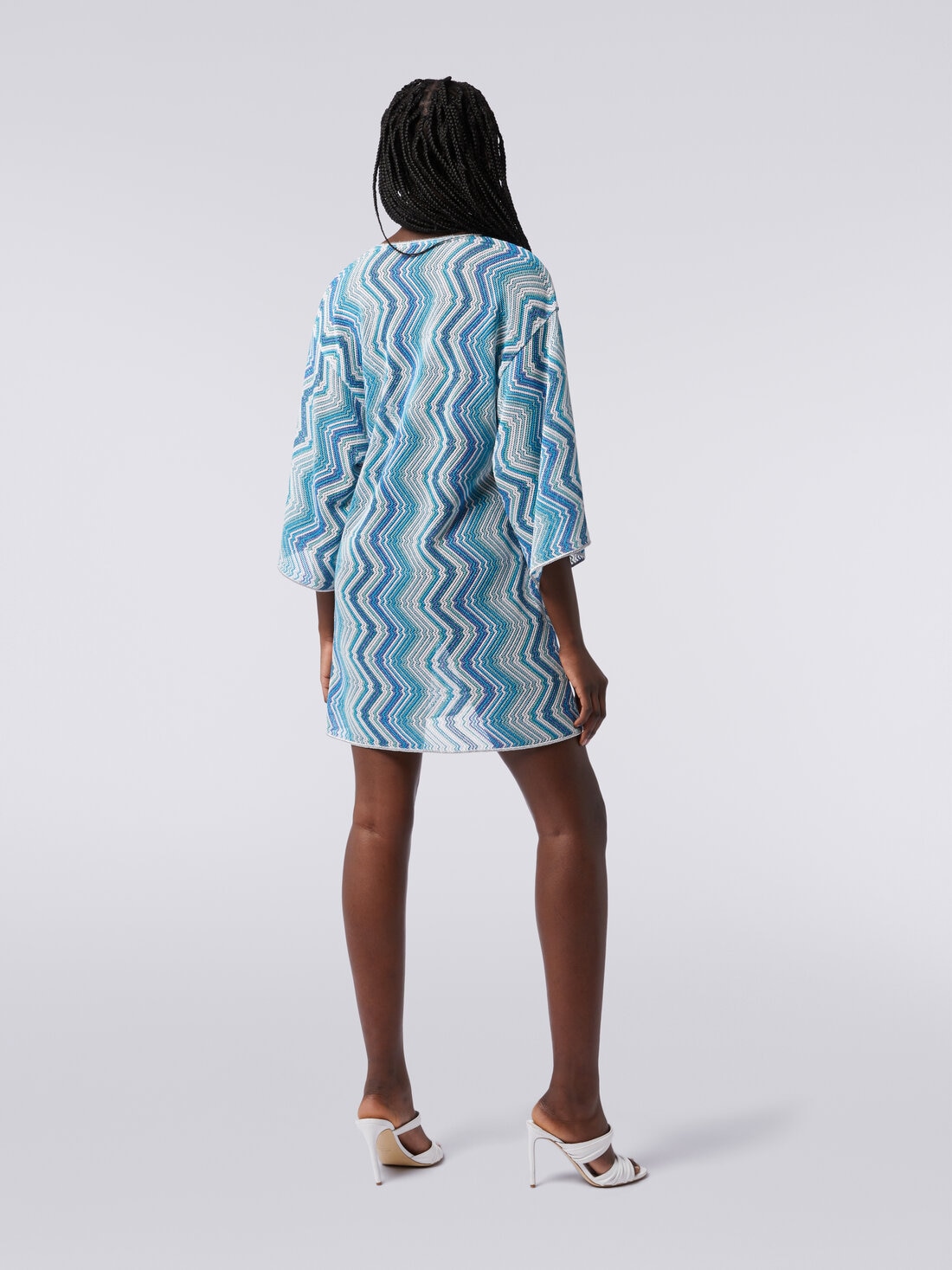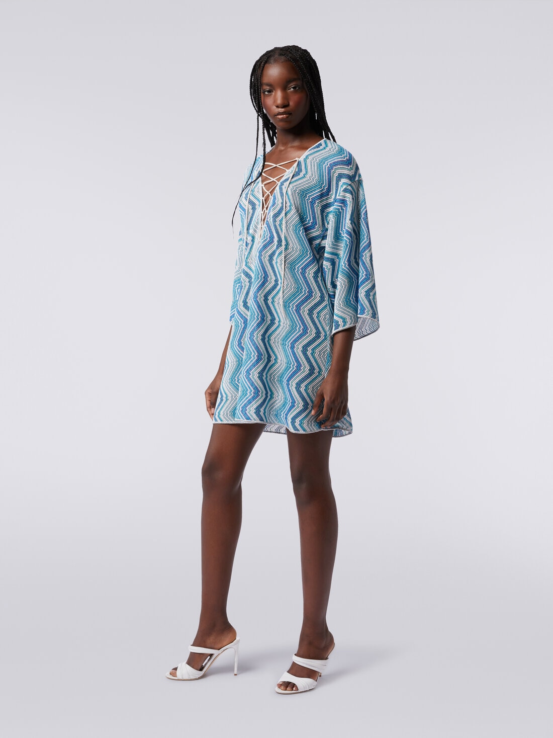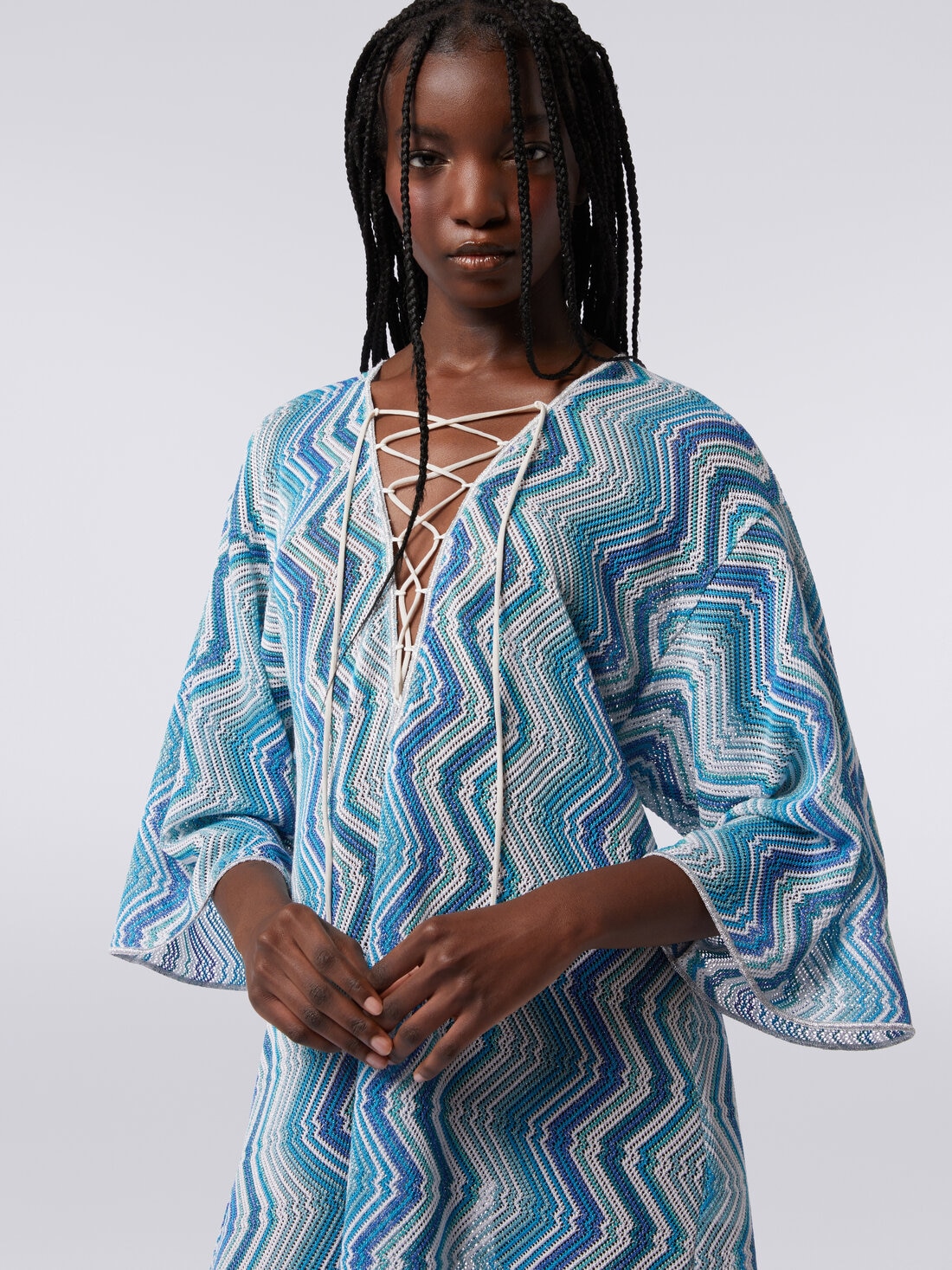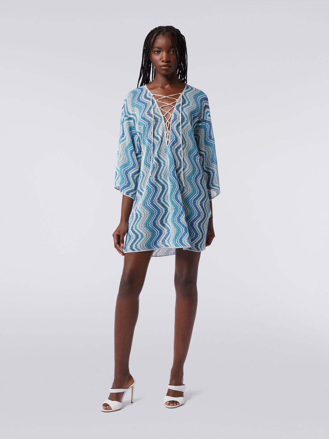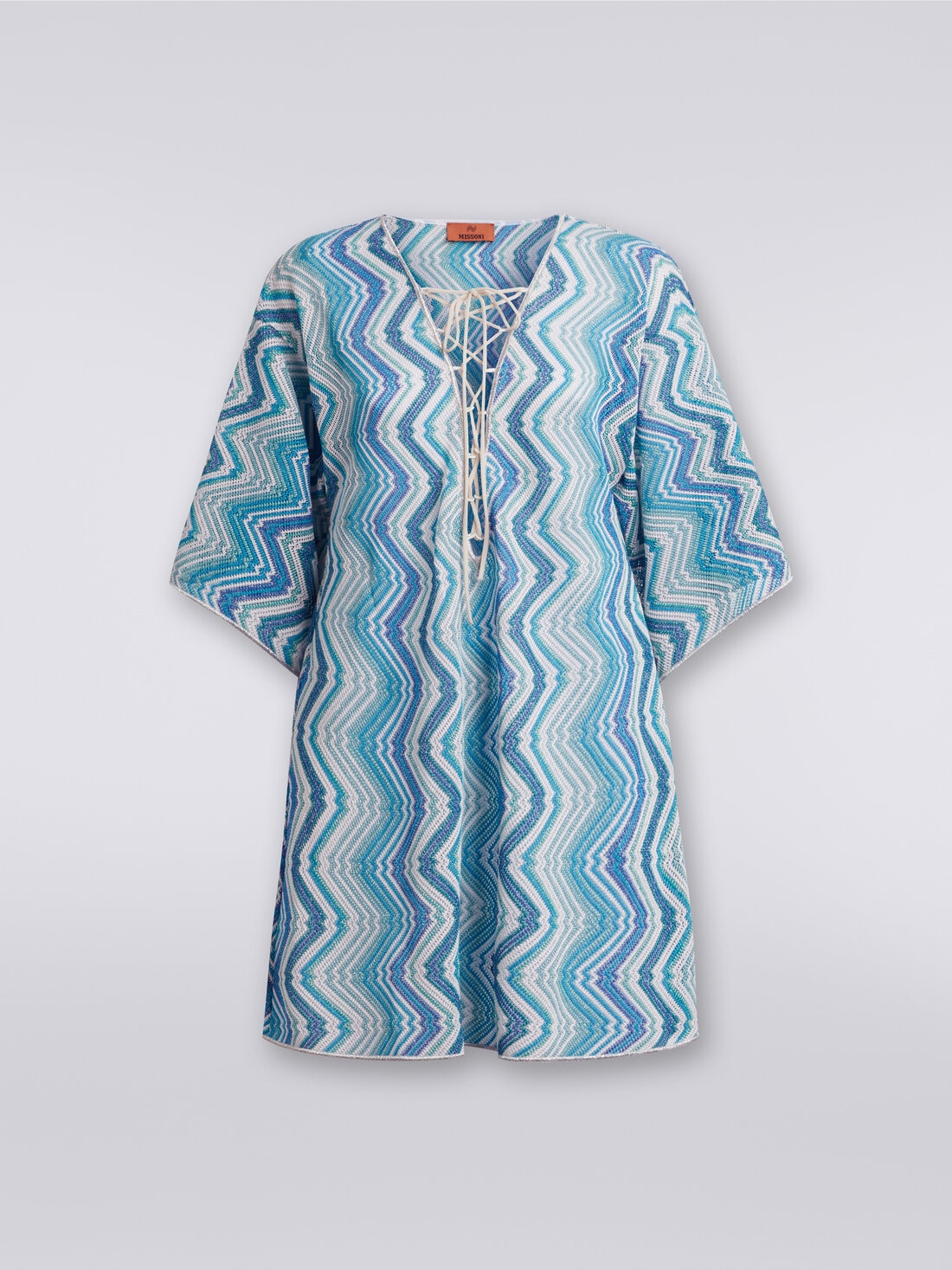 Liebhaberinnen des Strandlebens werden der Verlockung des von Missoni angebotenen kurzen Strandkleids aus Viskosemischgewebe nicht widerstehen können. Das elegante Kaftanmodell mit weiten Ärmeln, zarter Raschelverarbeitung und Chevronmotiv sorgt für einen edlen und raffinierten Look. Der tiefe Ausschnitt mit gekreuzter Schnürung verleiht einen Touch Sinnlichkeit und macht dieses Kleidungsstück geradezu perfekt für entspannte Tage am Strand.