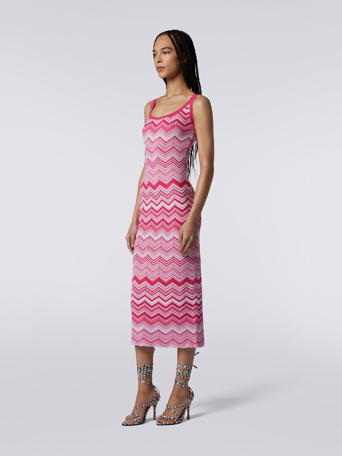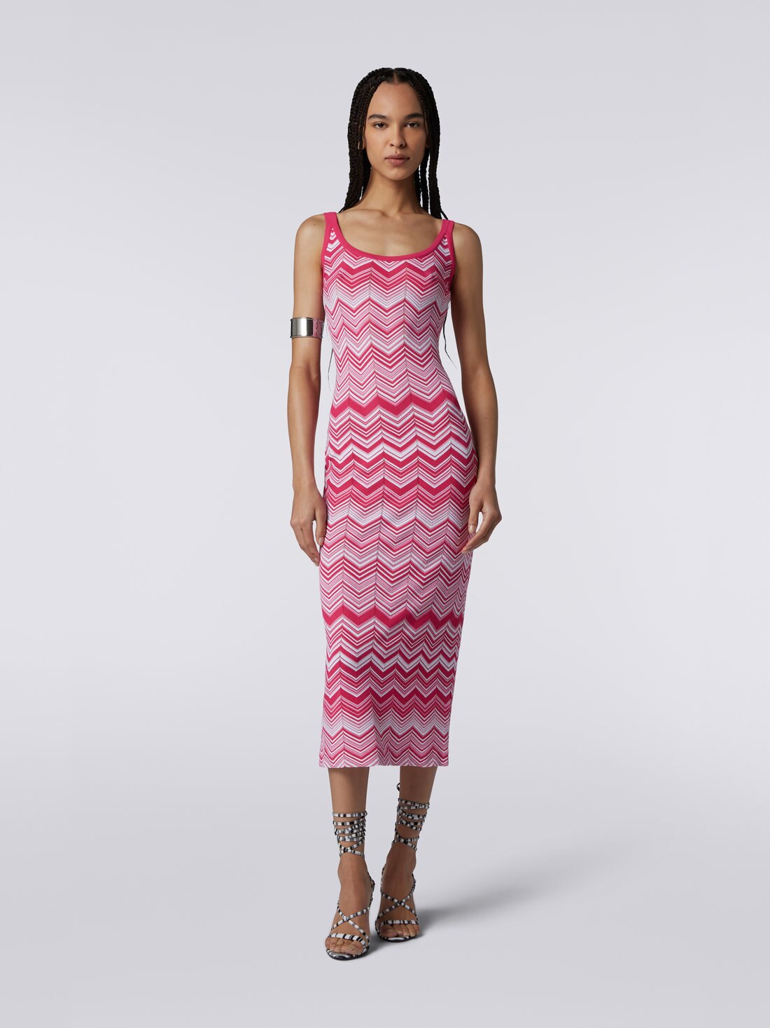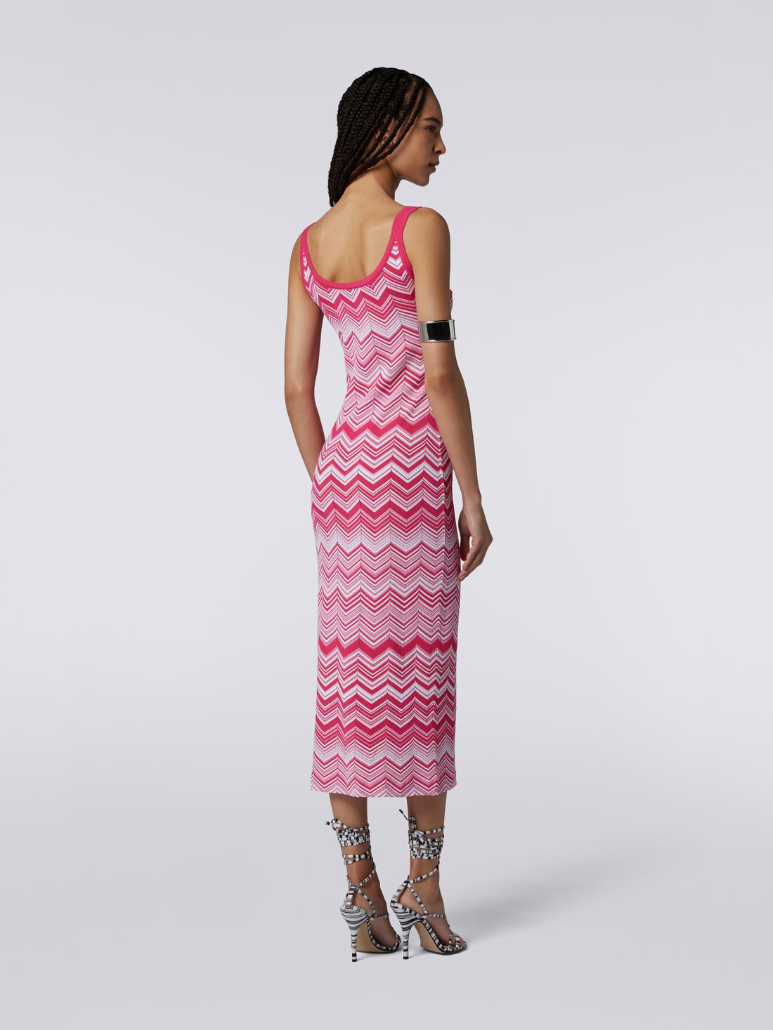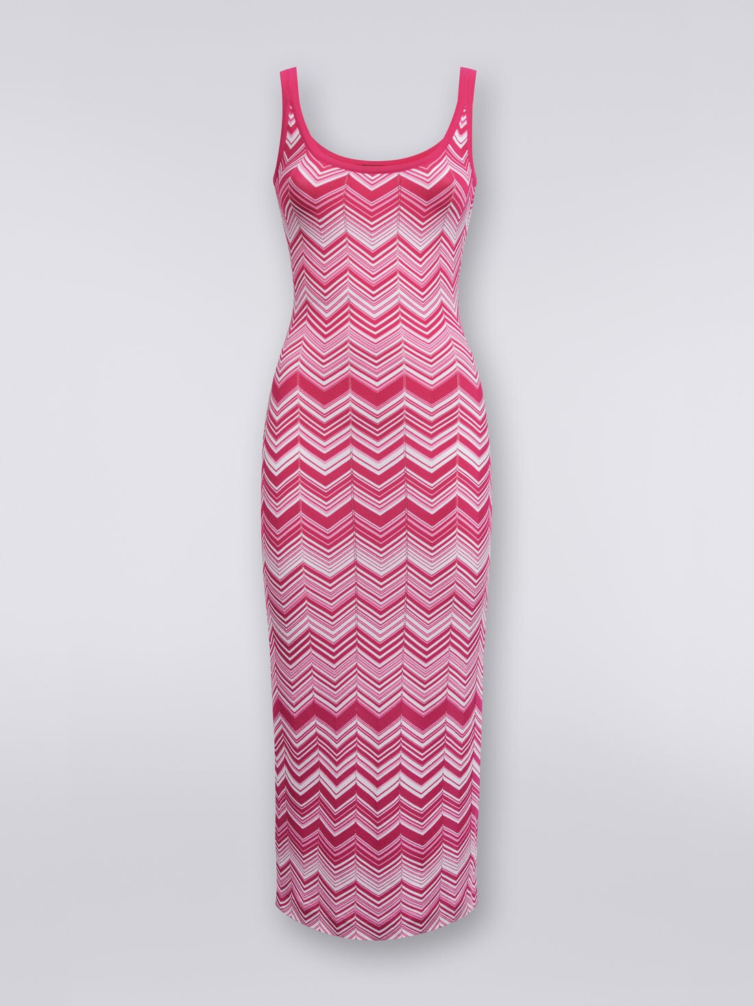 Das lange Damenkleid aus einem Stretch-Viskosemischgewebe mit zweifarbigem Chevronmuster umschmeichelt geradezu perfekt die Körperkontur. Die sonnigen Farben, kombiniert mit dem tiefem Ausschnitt vorne und hinten, sodass es wie ein Tank Top wirkt, machen es zu einem Wahrzeichen für die kommende Saison.