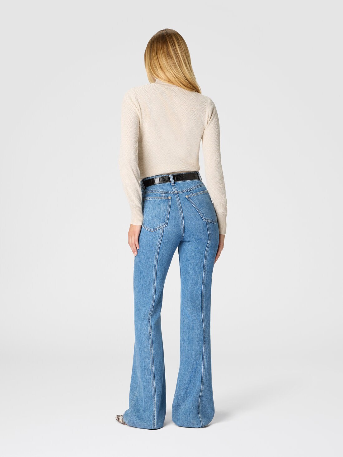 Ein Kleidungsstück mit essentiellem und unverwechselbarem Charakter. Dieser Damenpullover mit hohem Kragen und langen Ärmeln aus einer Mischung aus Baumwolle und Viskose zeichnet sich durch seine einfarbige Jacquard-Struktur aus, die durch das Chevron-Muster, das ikonische Merkmal des Missoni-Stils, bereichert wird.