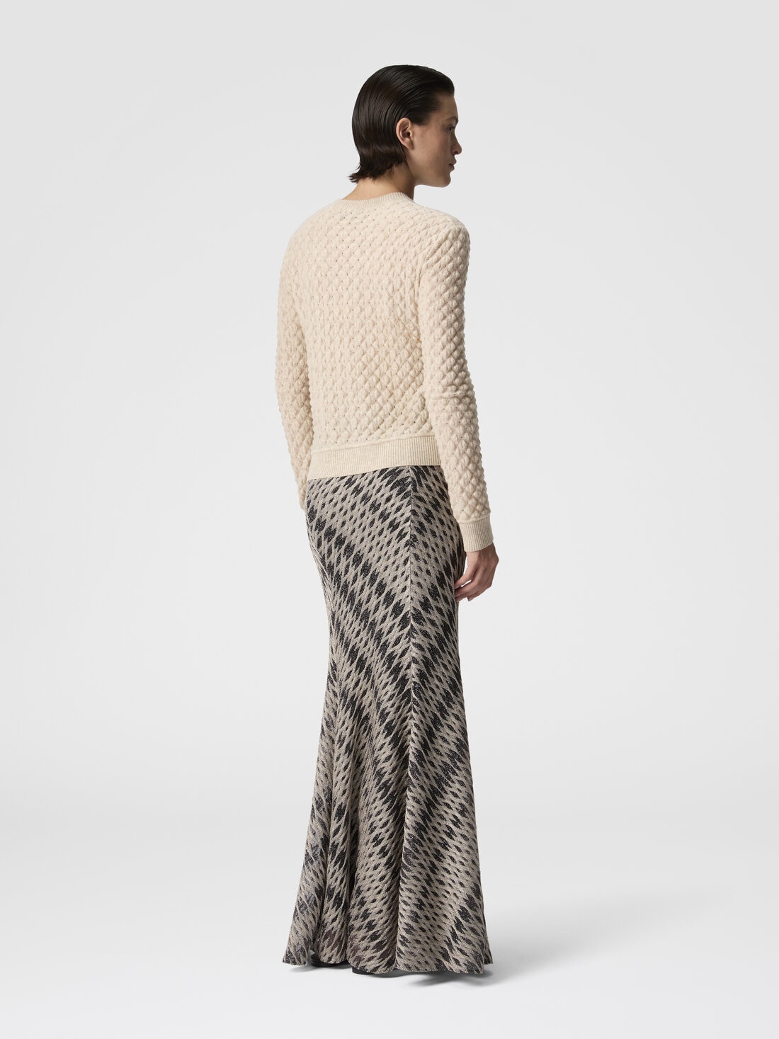 Elegant und anspruchsvoll: Dieser Damenpullover mit Rundhalsausschnitt aus 100% Kaschmir betont die Weichheit und Leichtigkeit des Garns – Ausdruck von Missonis stetigem Streben nach Qualität und Raffinesse in den Materialien, einer unverkennbaren Signatur des Hauses. Das zarte Spitzenmuster verleiht dem Strick Tiefe und Bewegung und schenkt dem Kleidungsstück eine dezente, anspruchsvolle Eleganz.