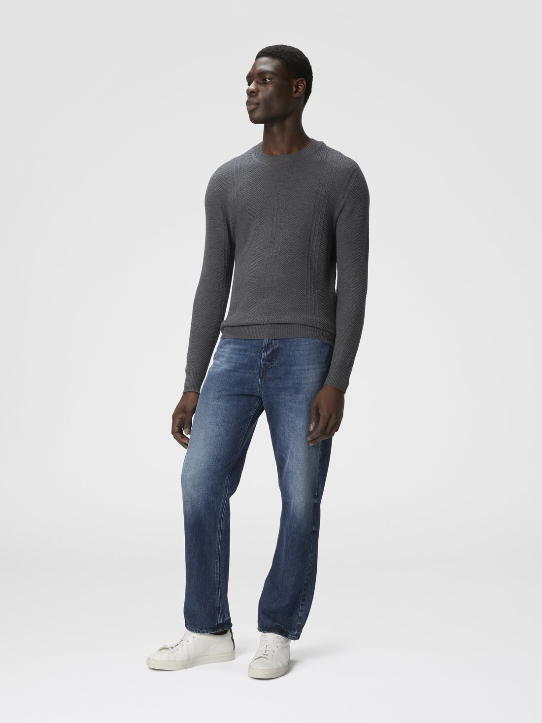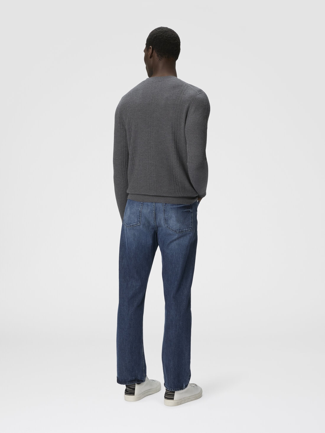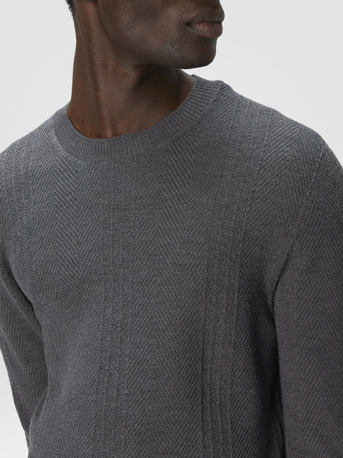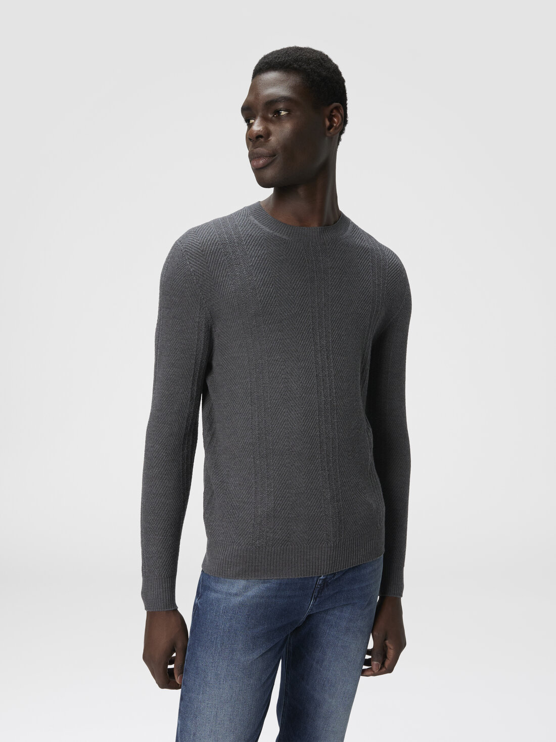 Dieser Rundhalspullover für Herren aus Wolle ist in edlem Reiskorn-Muster gearbeitet. Das Ton-in-Ton-Chevron-Motiv verleiht dem schlichten Design Tiefe – für einen puristischen und dennoch raffinierten Stil.