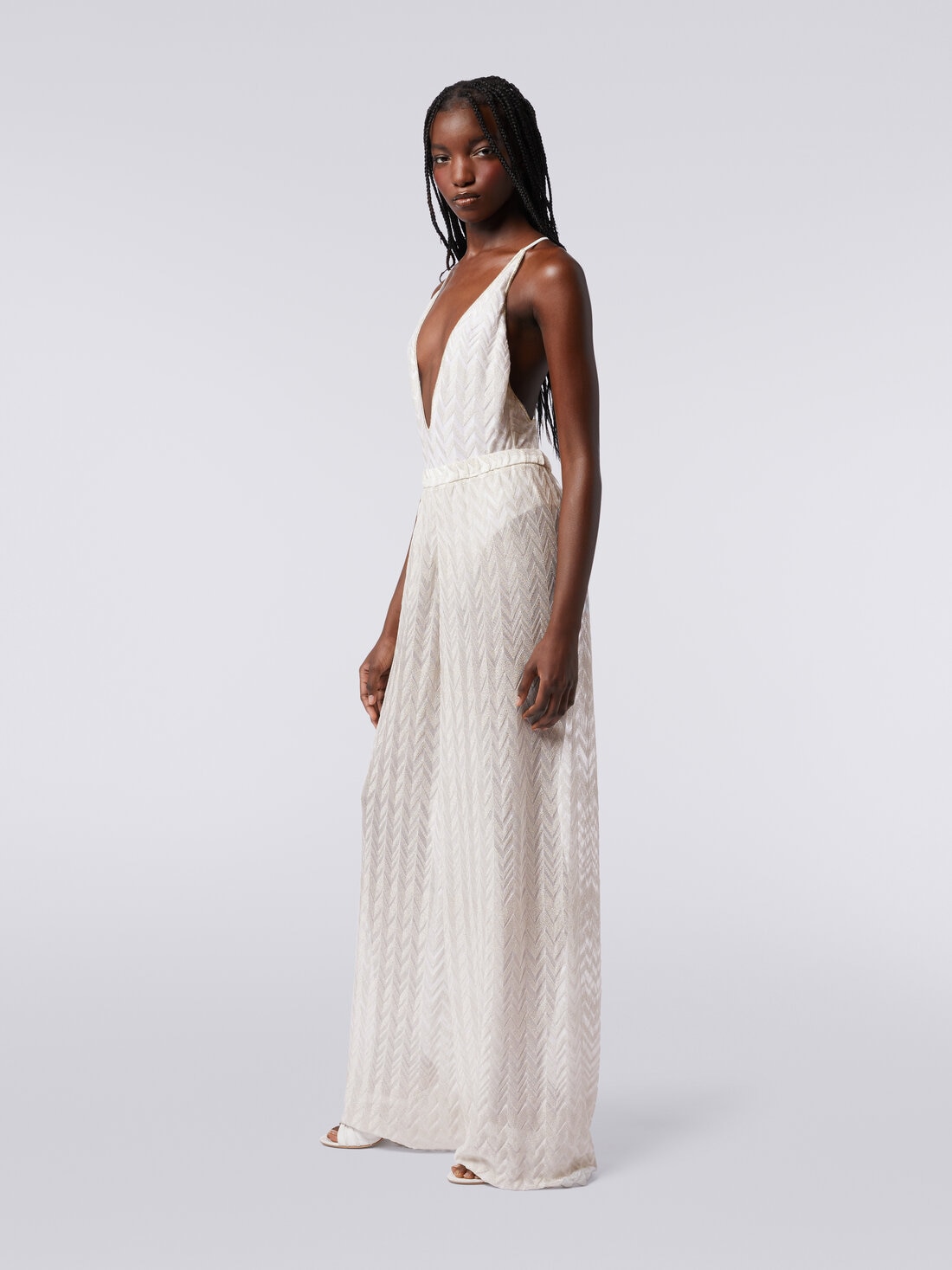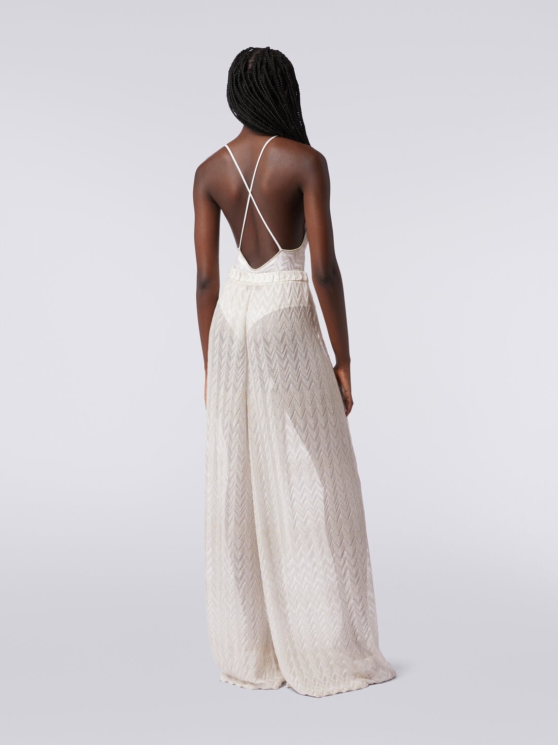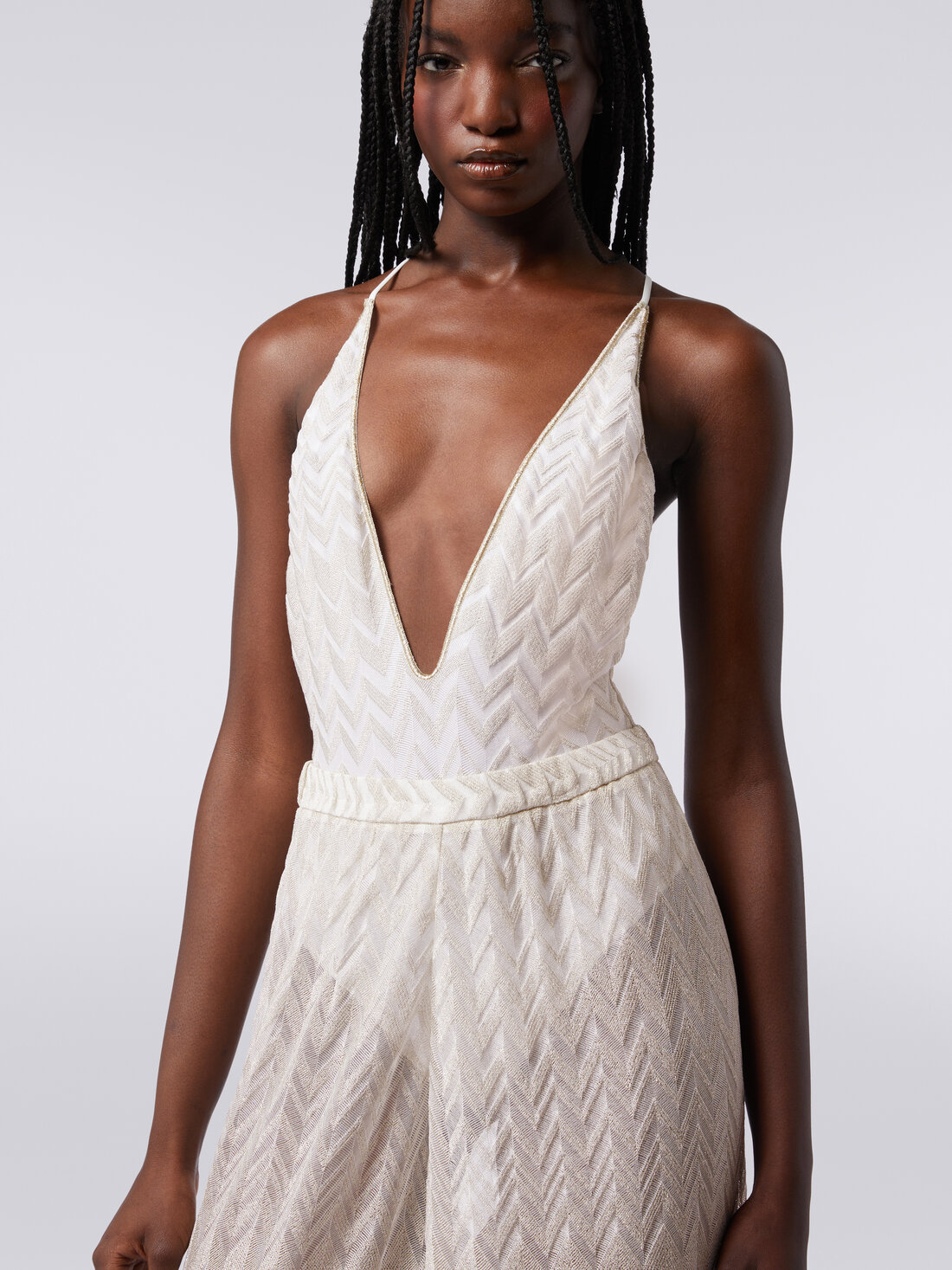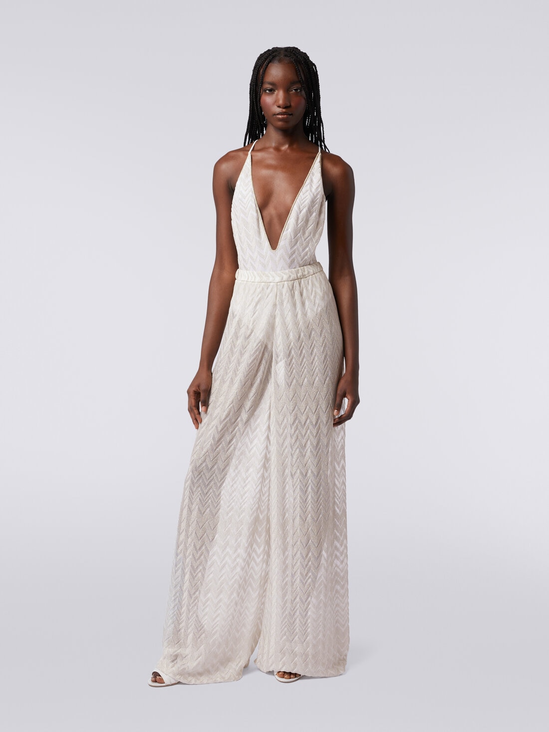 Die Hose zum Überziehen am Strand mit Ton-in-Ton-Chevronmuster besticht durch subtile und raffinierte Eleganz. Der Lamé-Stoff verleiht dem klassischen Chevronmuster von Missoni mehr Helligkeit und schafft einen äußerst raffinierten Look für Sommertage an Pool oder Strand.