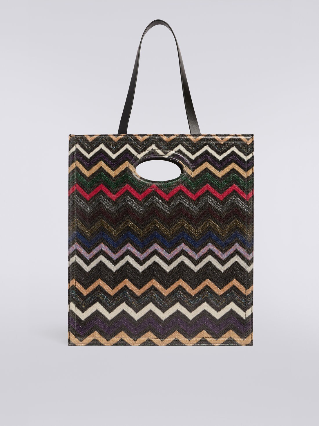 Die aus Viskose-Lamé mit Dégradé-Zickzackmuster gefertigte Missoni Handtasche ist ein originelles Style-Statement. Das charakteristische mehrfarbige Zickzackmuster verleiht dem Dessin eine lebendige, dynamische Note. Die spezielle Verarbeitung mit Lurex erzeugt ein Spiel aus Licht und Schatten, das die einzigartige Gestaltung des Accessoires hervorhebt.
