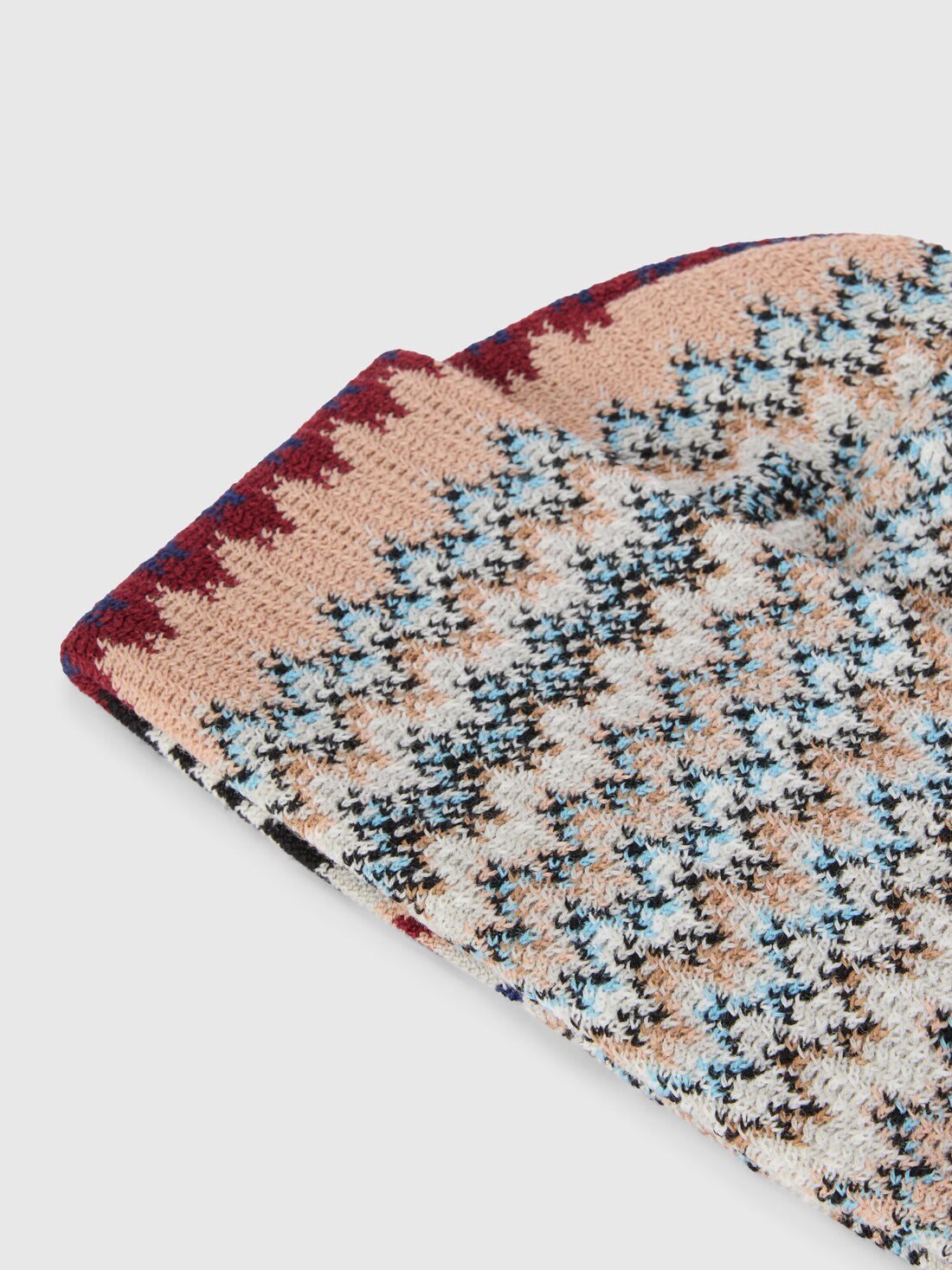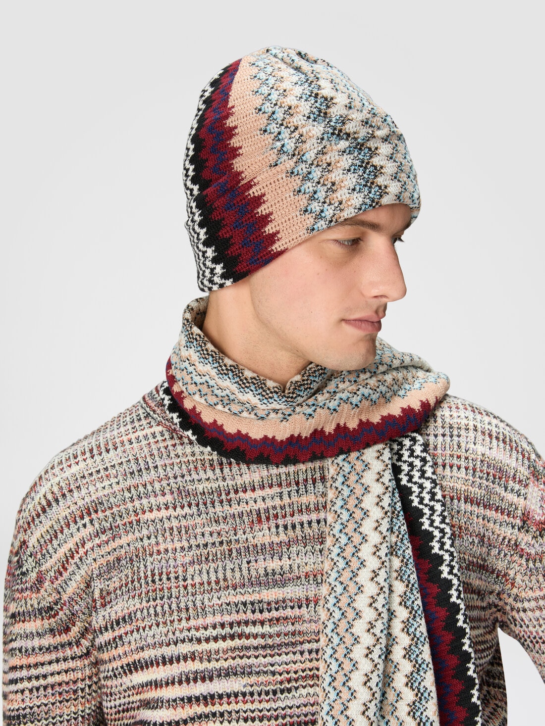 Ein unverzichtbares Accessoire für die kühleren Tage, das durch die Missoni-Behandlung zur Ikone wird: Hier ist die Herrenmütze aus Zickzack-Wollmischung mit hohem Revers.