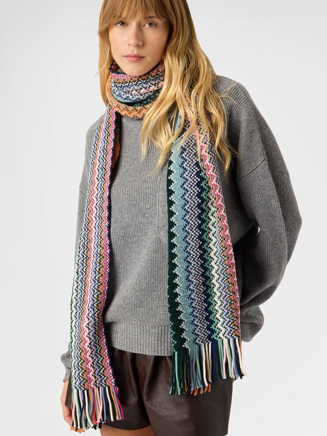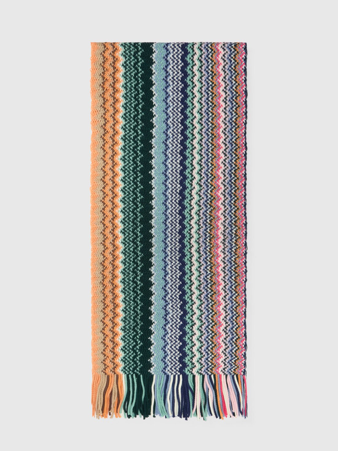 An iconic accessory of Missoni style, this women’s pure wool scarf with fringes features the signature chevron knit. The graphic pattern and soft fabric create a perfect balance of warmth, movement, and sophistication, elegantly completing any outfit.