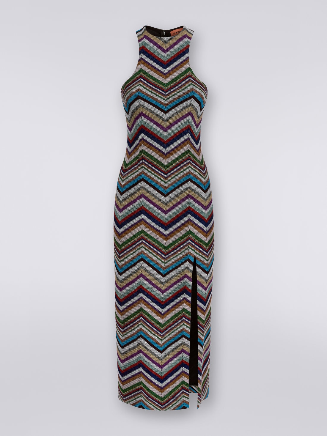 The glow of lurex lights up the viscose and wool blend zigzag knit of the women’s long dress. A piece that enhances the body’s silhouette and emphasises its shape, featuring an American neckline and a deep side slit.