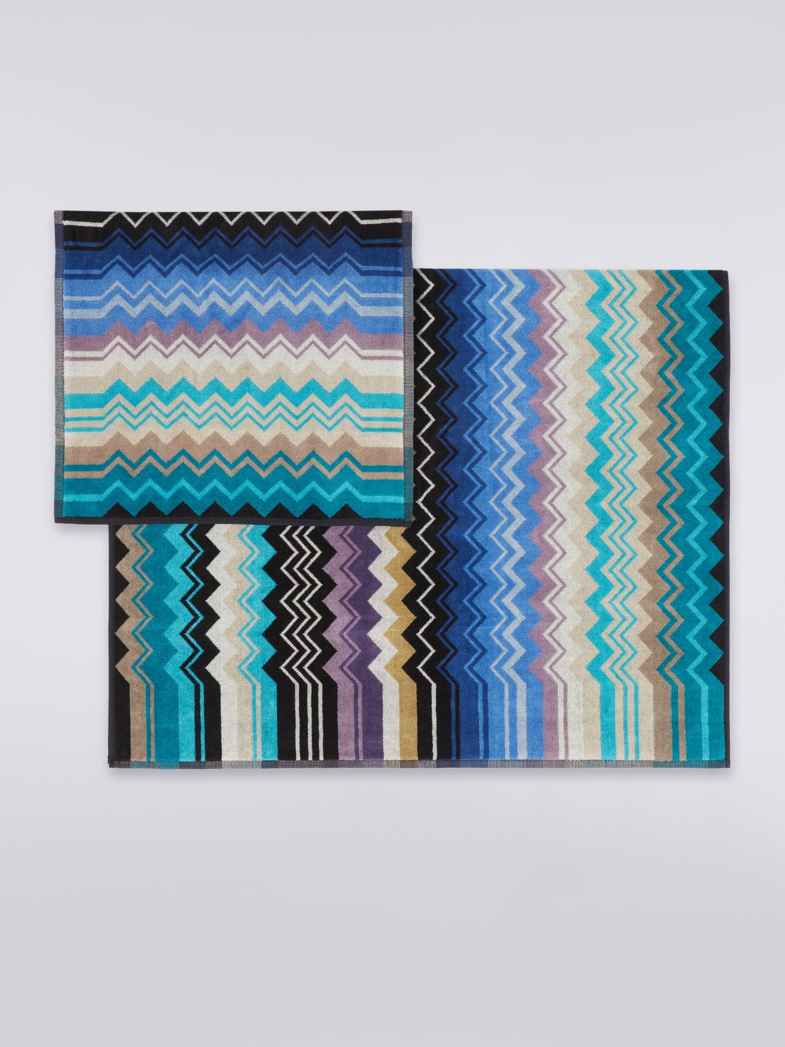 The Giacomo two-piece towel set is the quintessence of Missoni style: here, the quality of the velour cotton terry meets the definition of the chevron print, which dips into the striped edges to enliven this beautiful and timeless pair of face and guest towels.