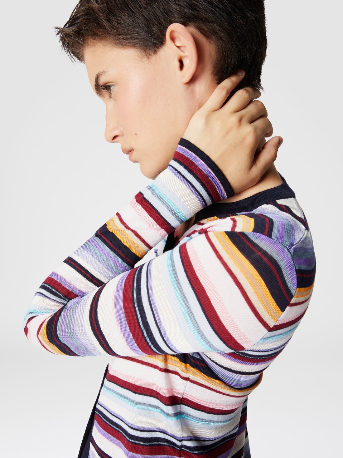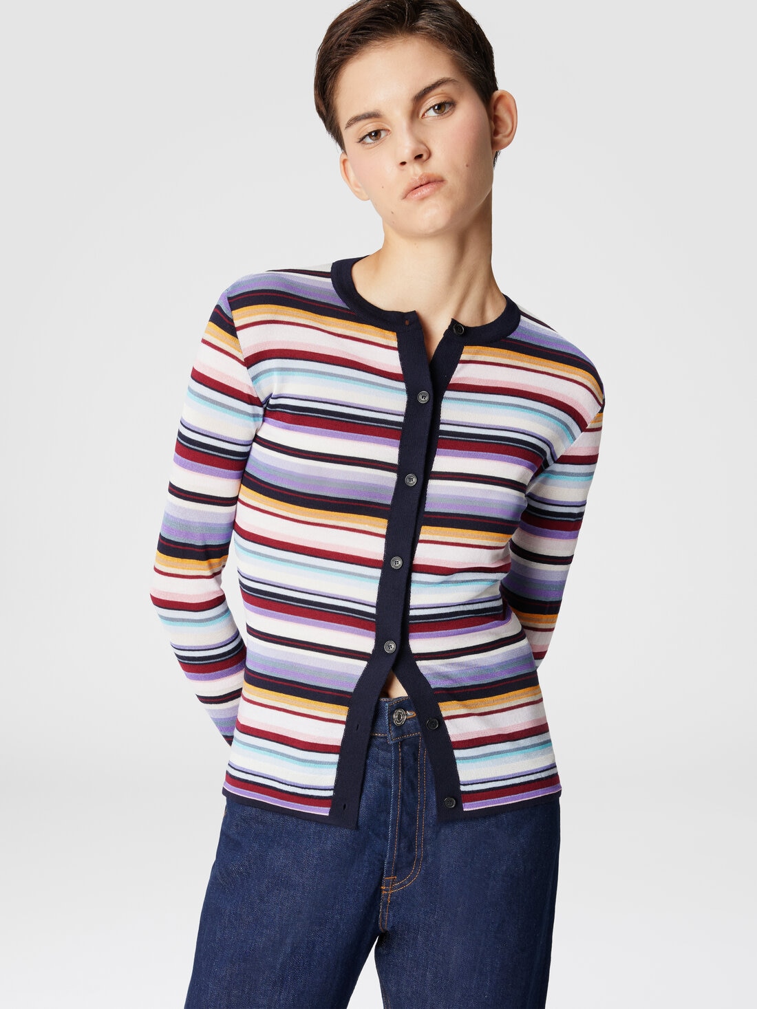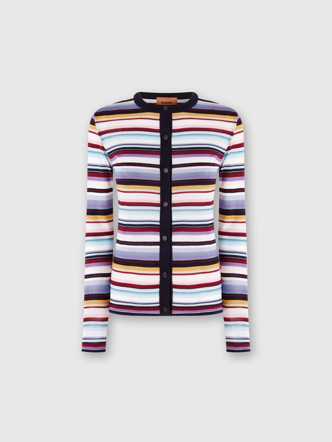 A blend of wool and viscose characterizes the very fine stockinette stitch with which the buttoned cardigan is constructed. The model, with a linear cut, is made immediately recognizable by the striped motif of different backgrounds, finished with contrasting profiles.