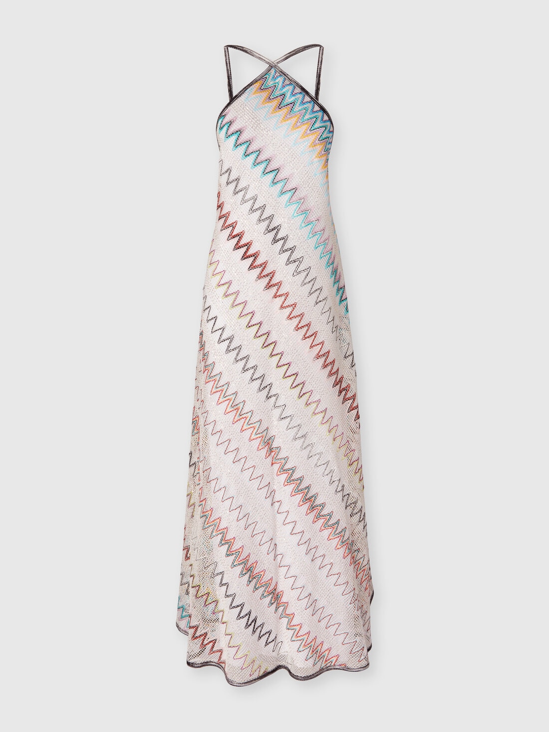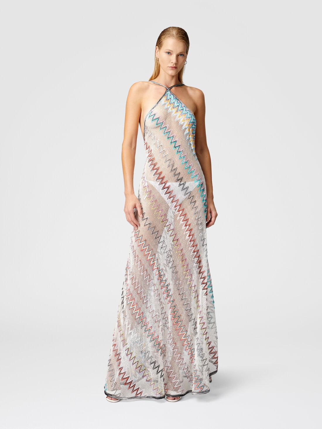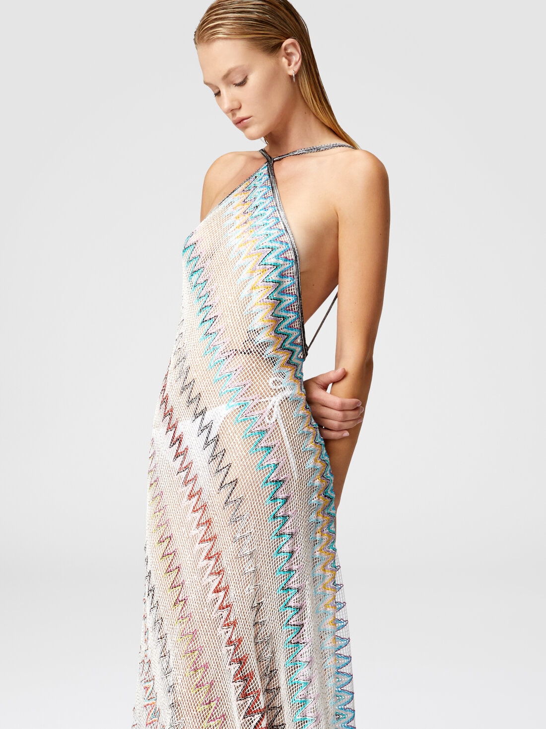 The mesh cover-up dress with zigzag pattern and sequins is a celebration of transparency and light. Crafted from lightweight, shimmering fabric, the garment features a halter neckline and an open back, with contrasting straps that add a graphic touch. The mesh work creates a seductive and sophisticated effect, transforming this dress into a key piece for a summer look with a glamorous and refined spirit.