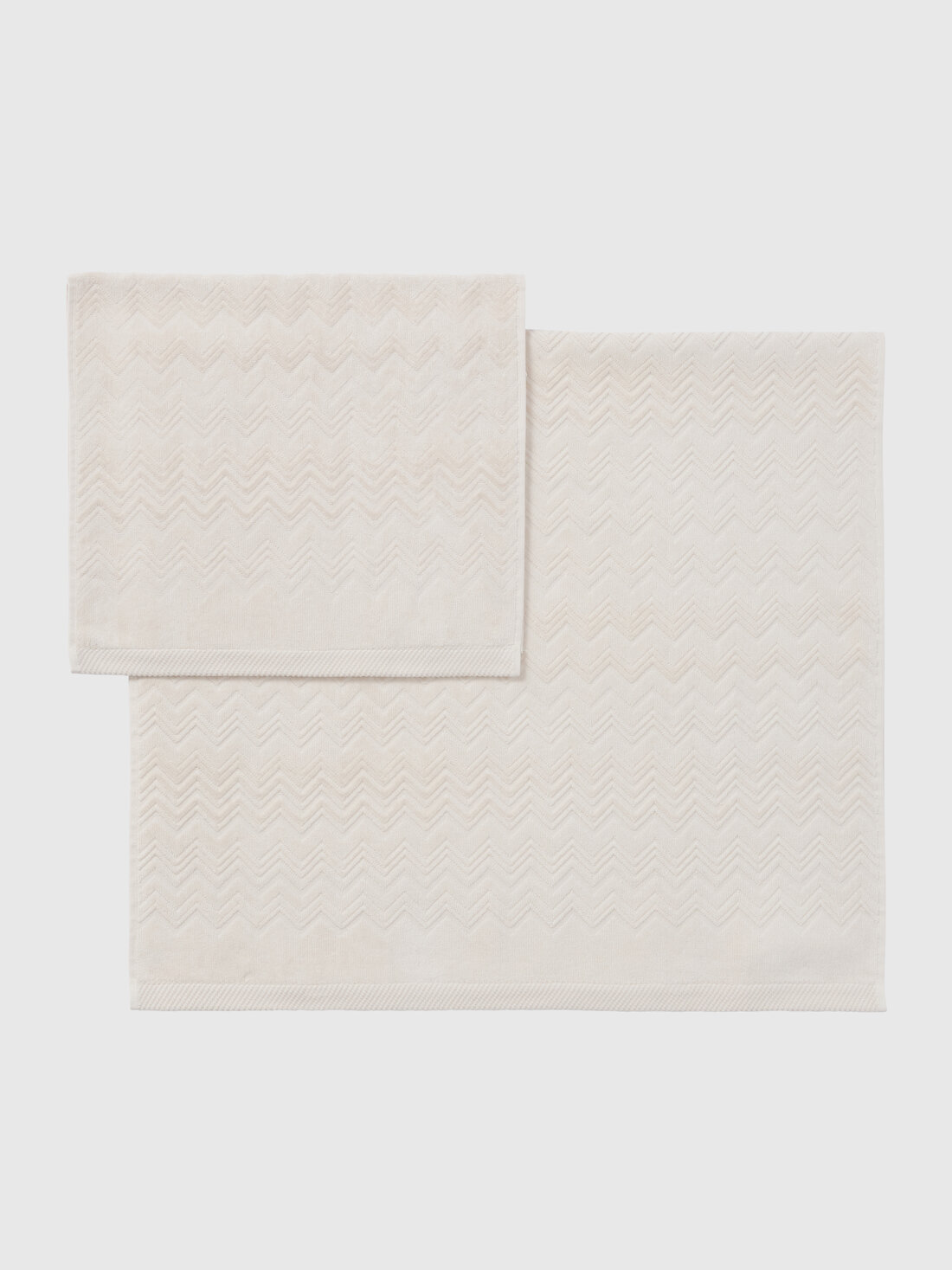 MissoniHome rethinks everyday luxury with Chalk, the set consisting of two bath towels. Made of soft cotton terry velour, the towels display a delicate tonal zigzag pattern, adding a touch of elegance to the room. A classy accent that turns routine into an experience of absolute comfort.