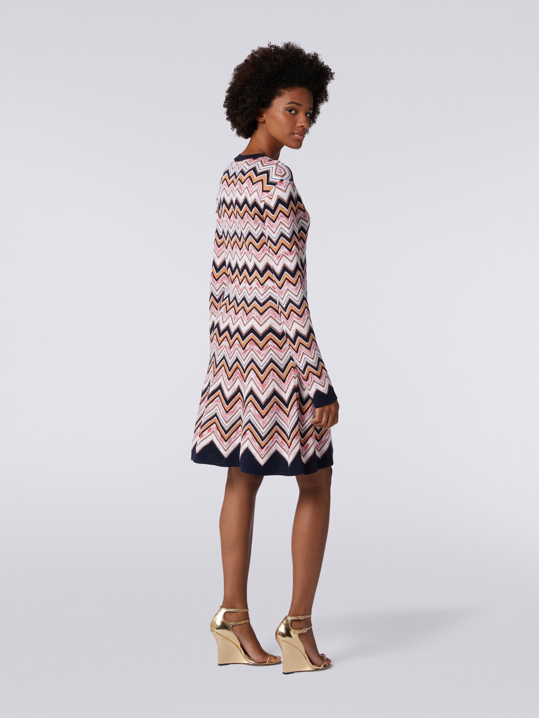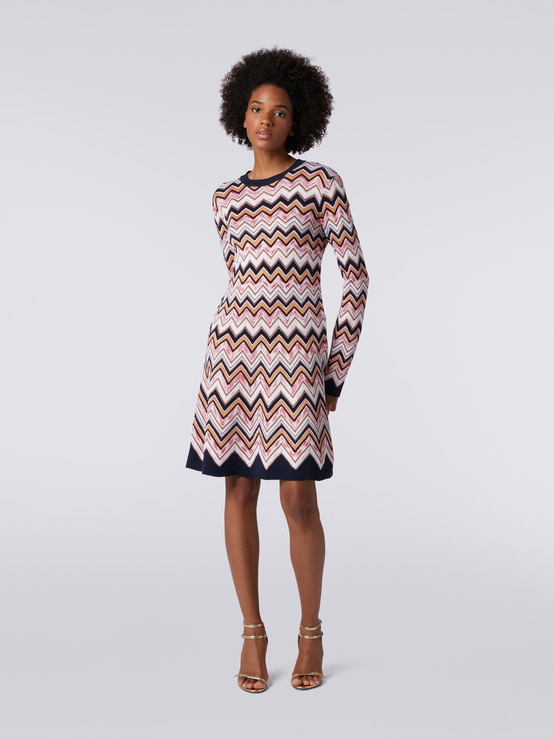 The women’s wool and viscose zigzag knit dress subtly follows the body’s silhouette. The round-neck piece with a flared finish features long sleeves, contrasting trim and flounces that add a touch of sophisticated elegance and femininity.