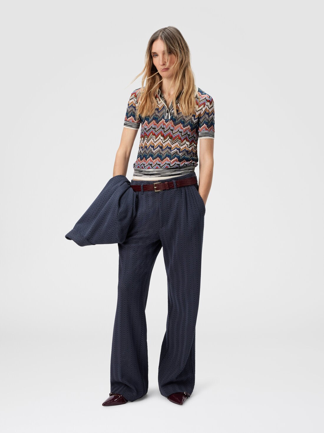 An expression of craftsmanship and iconic style, this short-sleeve polo shirt with collar for women is made with refined raschel lacework that reinterprets Missoni’s iconic zigzag in a sophisticated way. Lamé threads provide a light and precious brightness, enhancing a design that unites modern elegance and the maison’s distinctive identity.
