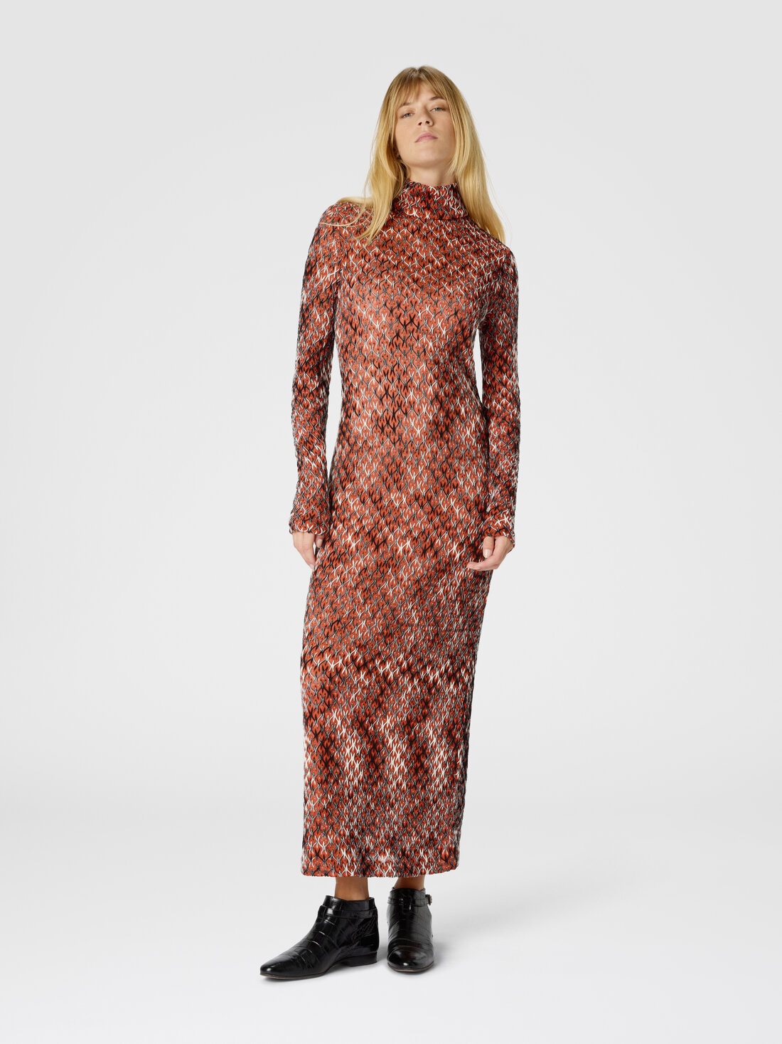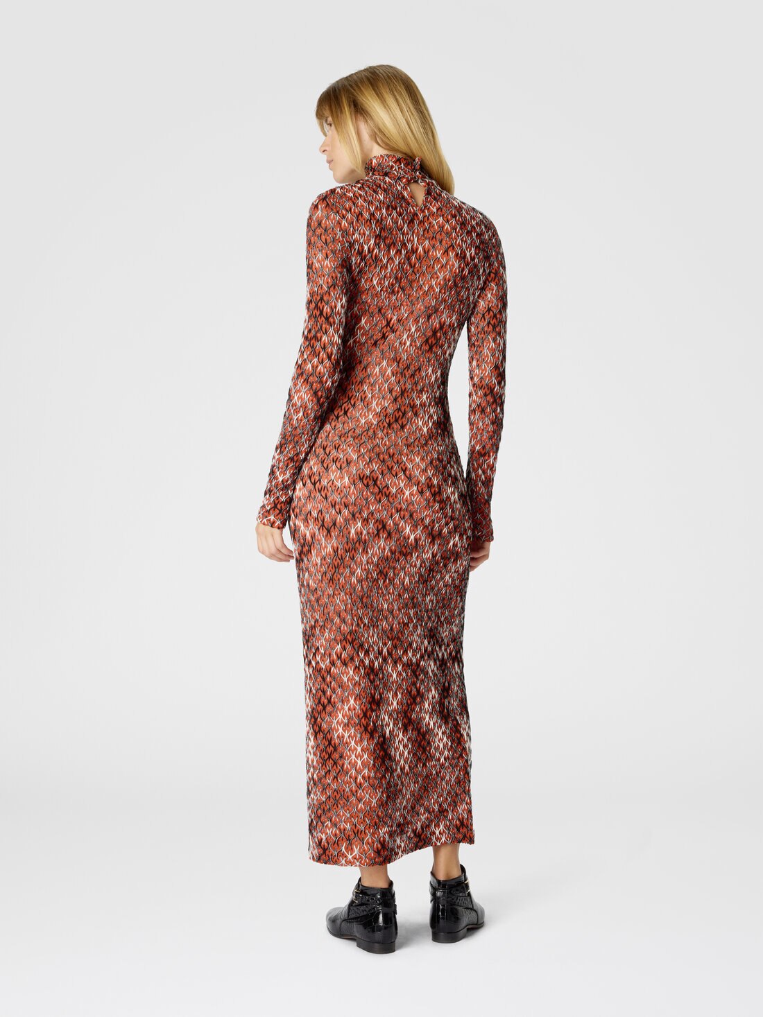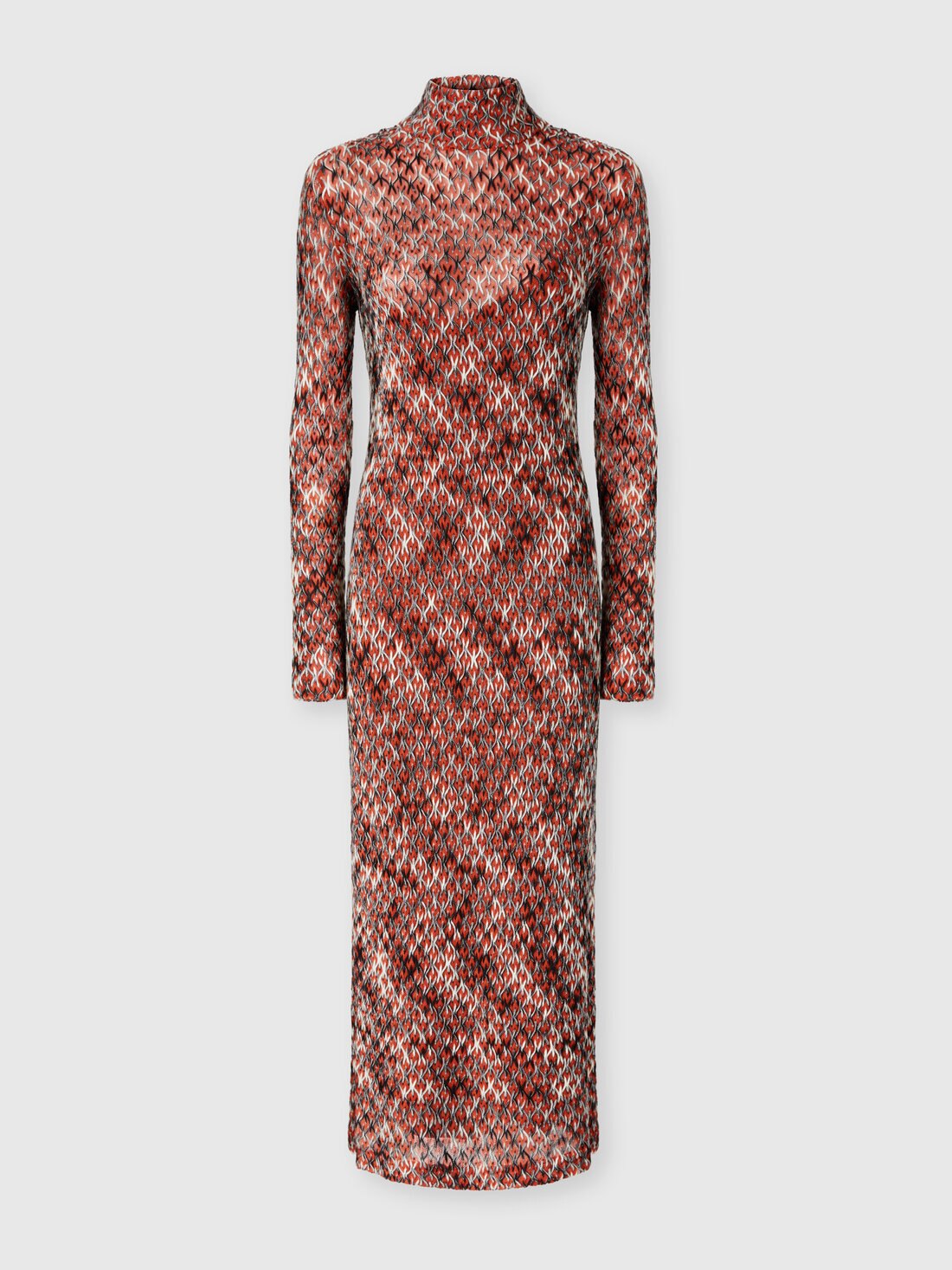 A synthesis of sophisticated elegance and textile savoir-faire, this long women’s dress with high neck and long sleeves is crafted from a refined raschel knit in flamed lace. The wool and viscose blend gives the fabric a warm yet lightweight texture, enhancing both the richness of the pattern and the flow of the silhouette.
