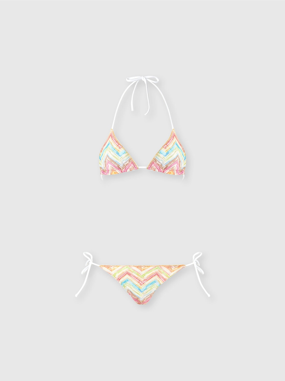 This triangle bikini in printed raschel tulle combines lightness and liveliness thanks to the zigzag pattern that characterizes the fabric. The V-neck and center gathering enhance the décolleté, while the lace-up briefs offer an adjustable fit. A pop and refined two-piece, ideal for those looking for a beach look that captures attention with style.