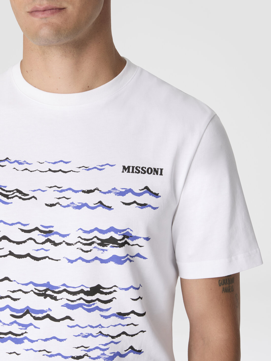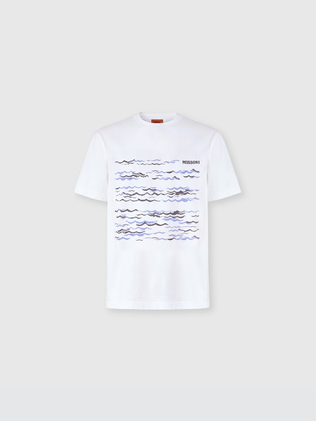The wave print of this men’s crew-neck cotton T-shirt evokes the energy and freedom of the summer season. The Missoni logo completes the design, signing the piece with the Maison’s unmistakable identity.