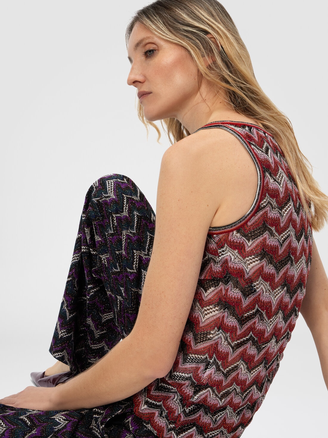 A women’s tank top with a refined spirit, featuring a round neckline and raschel lace design that echoes Missoni’s iconic zigzag. Made from viscose blend with lamé threads, it combines light and texture in a perfect balance of elegance and stylistic identity.