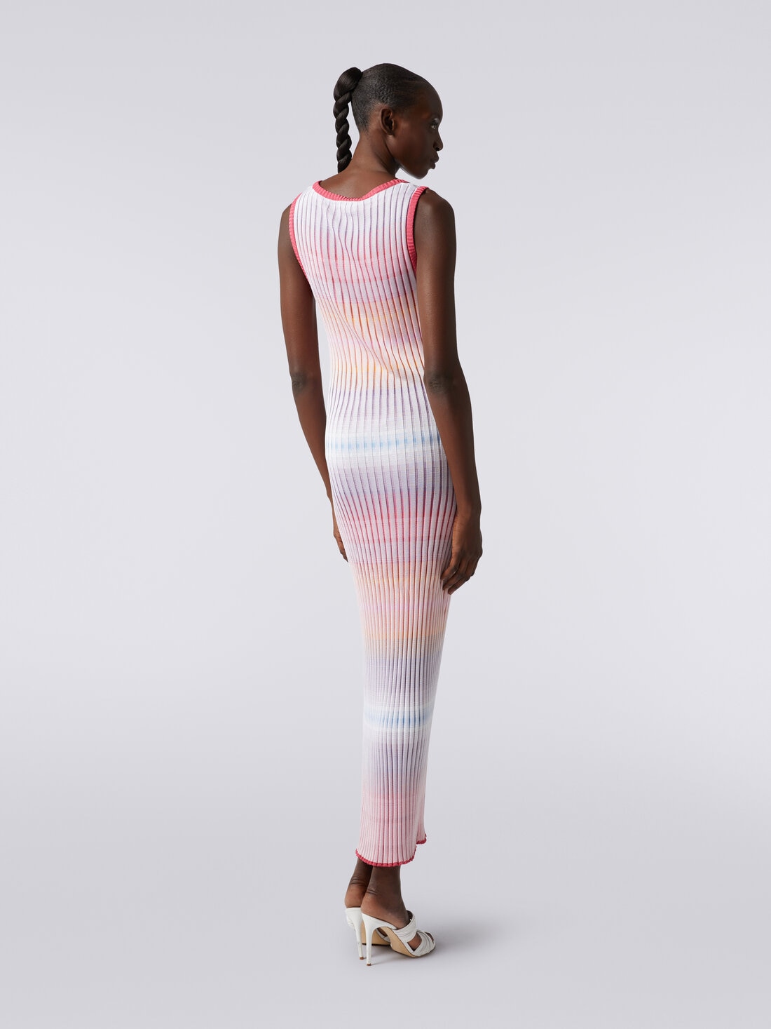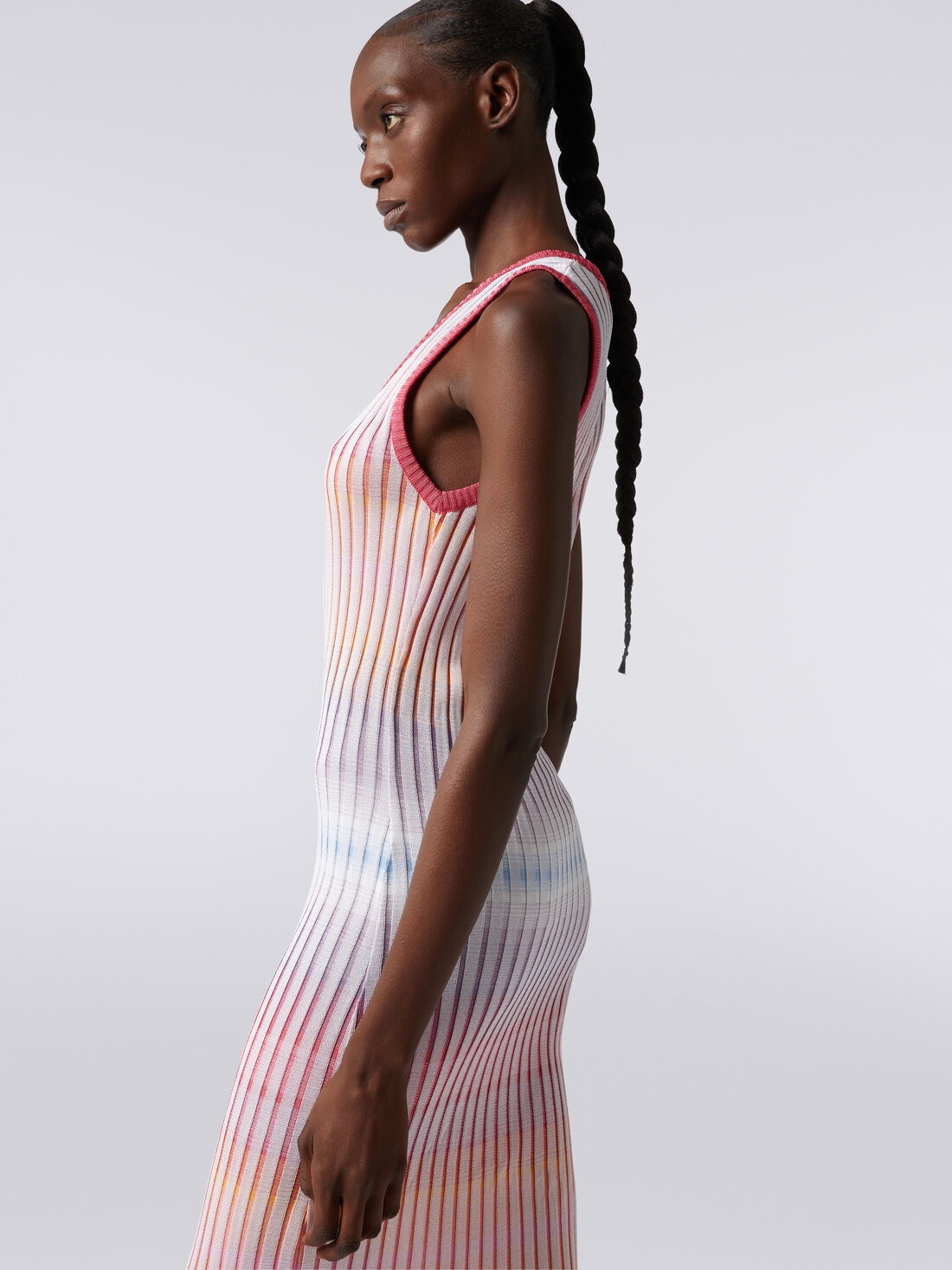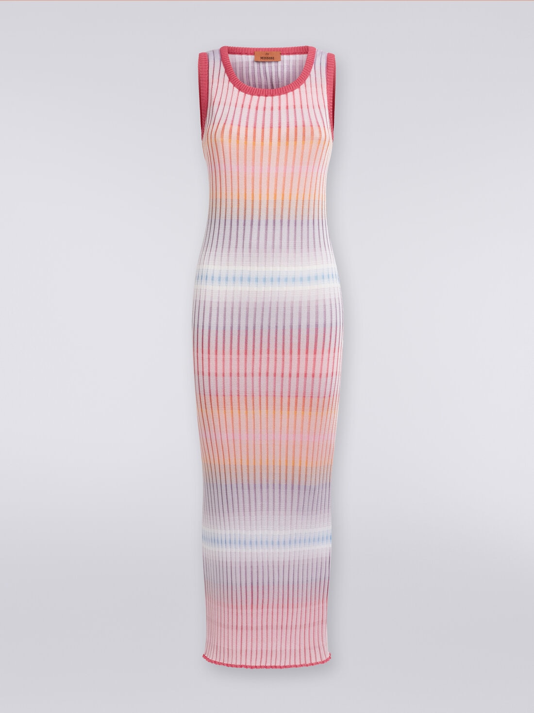 A refined knitwork with a thousand nuances for the pure viscose ribbed knit with a 7.2-gauge of the women's long dress. The model with a sensual round neckline and sleeveless features contrasting trim.