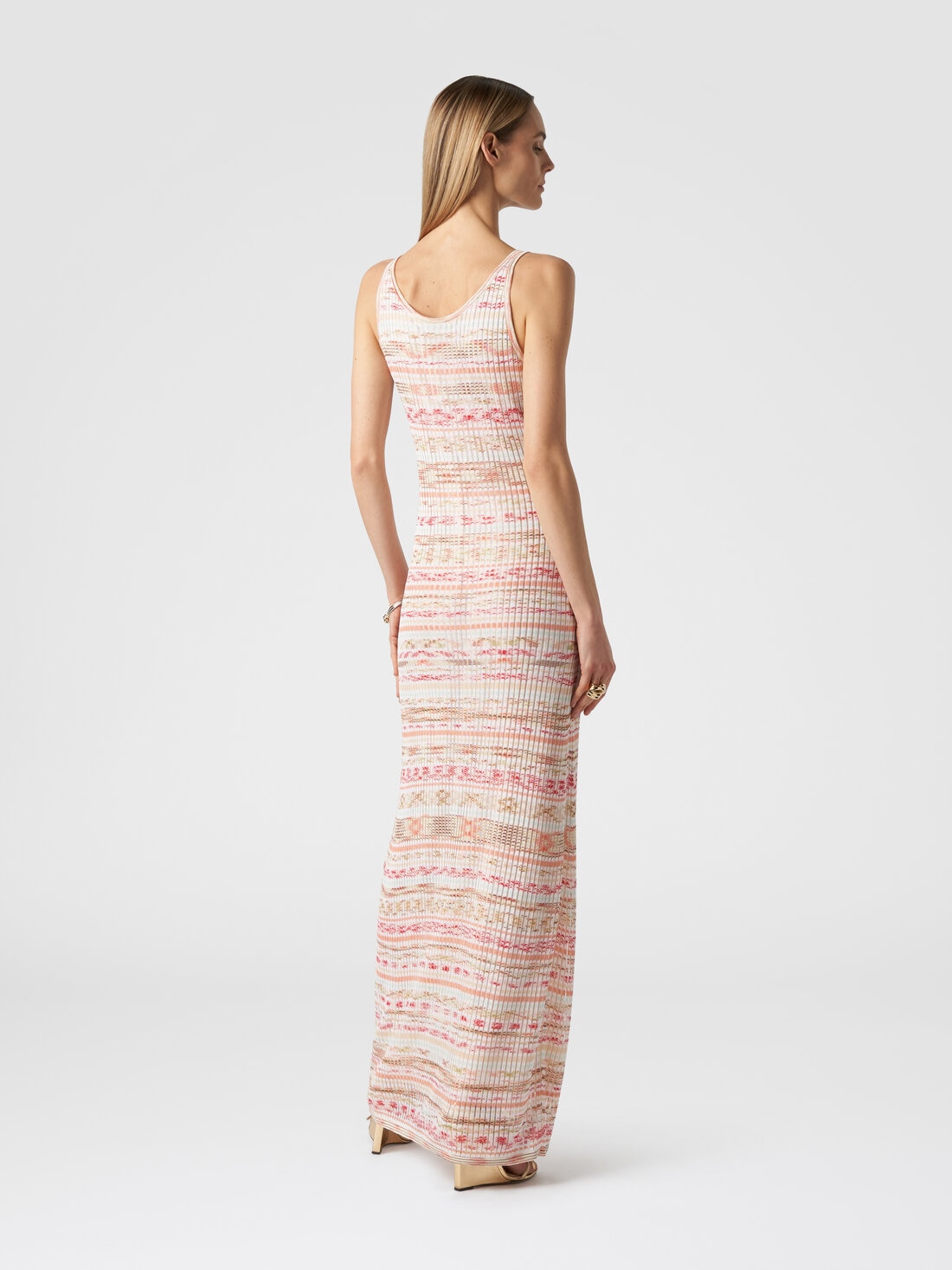 Perfect for showcasing the body’s silhouette, this women’s long dress is made of pure viscose ribbed knit and is entirely covered in a slub pattern. The tank top cut featuring a plunge neckline front and back, make it the best symbol of the season ahead.