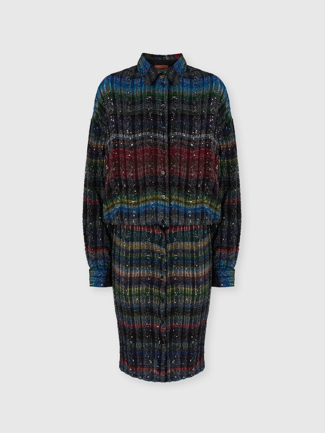 Luminous and sophisticated elegance defines this women’s midi dress with a V-neckline and long sleeves, accentuated by a row of buttons that discreetly emphasize femininity. Crafted on a woven Caperdoni loom, it features a refined wave pattern in viscose blend, enriched with sequins and lamé threads that lend the piece precious reflections and a contemporary allure. A striking dress for those who seek to stand out with grace and refinement.